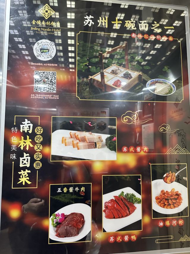 酱鸭,吴越小炒,手剥河虾仁,苏式拉糕,松鼠桂鱼,南林红卤面,响油鳝糊,牛排,刺身,传统苏式小面,奥灶面,龙骨山药汤