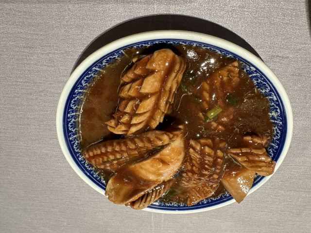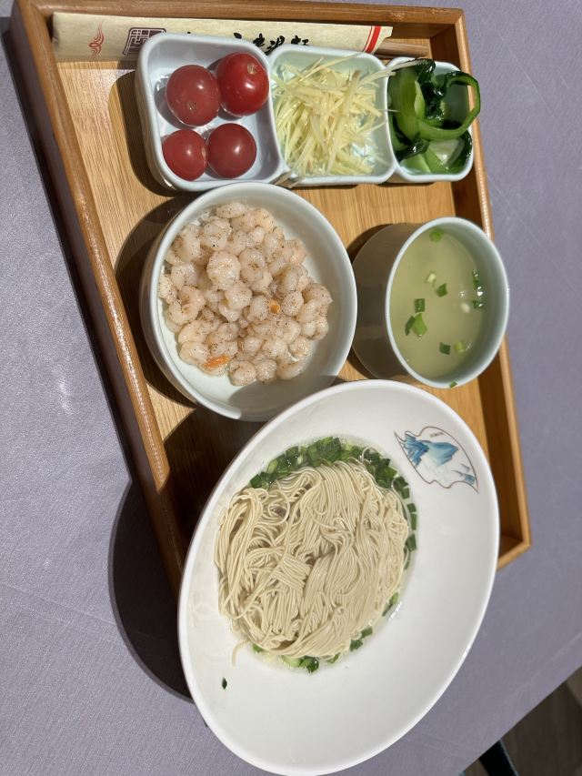 老东吴食府,是一家经营苏州菜的餐厅。老东吴食府餐厅的装潢典雅大方,环境优美,桌椅干净整洁。 扁尖烧肉、多宝鱼、温州粉丝、酱油虾等式餐厅的主推特色菜。酱油虾选用新鲜的河虾洗净,放在七成热的锅中煎至河虾呈鲜红色时,烹黄酒加盖略焖片刻,解腥味;再加酱油、白糖、姜末、毛豆、肉清汤,旺火烧开后,移小火再烧7~8 分钟左右,至虾肉成熟; 再用旺火收紧汤汁,然后加味精,用湿淀粉勾芡推匀,撒上葱花,浇上猪油; 再端起炒锅,在锅中悬空翻身,使卤汁紧包虾身; 虾肉香嫩滑口,味美鲜香。 餐厅服务员的服务态度很好。