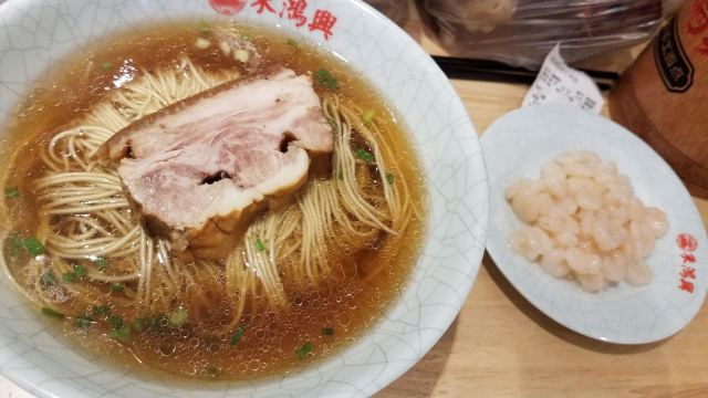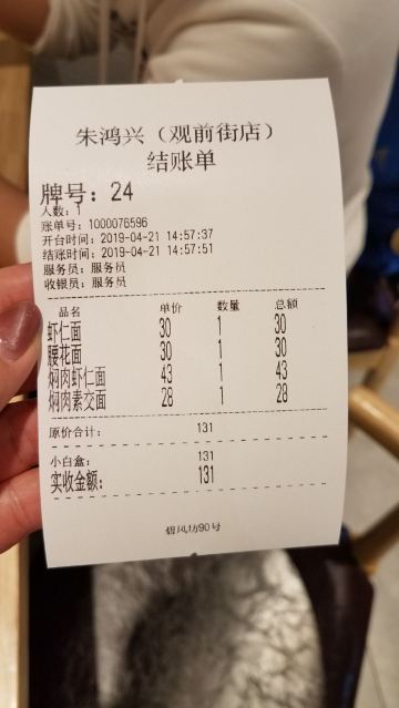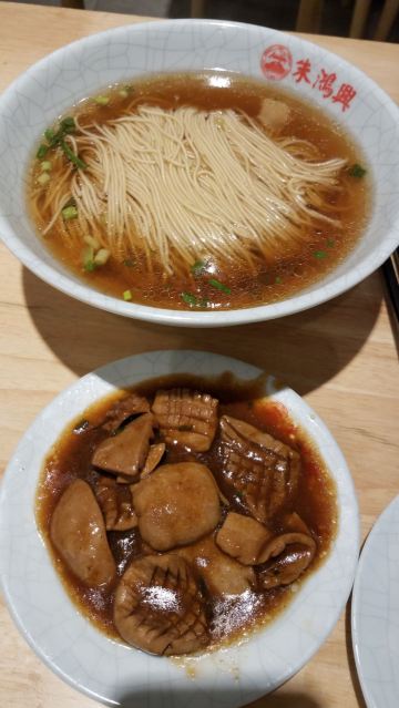 味道非常好,完全对得起朱鸿兴面馆这块金字招牌,喜欢面食的朋友一定要去试下。面馆从1938年3月开张,从一家不足30平方米的面馄店开始供应焖肉面、爆鱼面、爆鳝面、蹄面、冻鸡面和汤包、小笼等各式点心,并利用本地的特产,先后推出了咖喱蛋汁排骨;虾仁蟹粉;虾爆鳝糊等中高档面浇头。 这次我们点了虾仁面、焖肉面、腰花面,都是朱鸿兴的招牌。真的不枉费我们跑大远来吃,面条筋道,汤水鲜美清爽,焖肉炖得酥烂,入口即化,赞赞赞,价格也不算贵。
