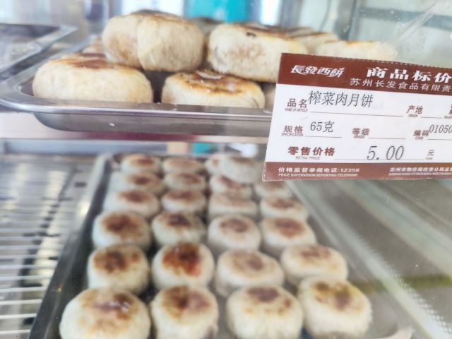 长发西饼算是苏州的名店了,面包中规中矩,蛋糕口感不错,松软香甜,最令人印象深刻的是每年中秋他家总是门庭若市——前来购买鲜肉月饼的顾客排成长长的队伍。长发西饼的鲜肉月饼确实很好吃,外皮很薄,内里汤汁和肉都很鲜美。