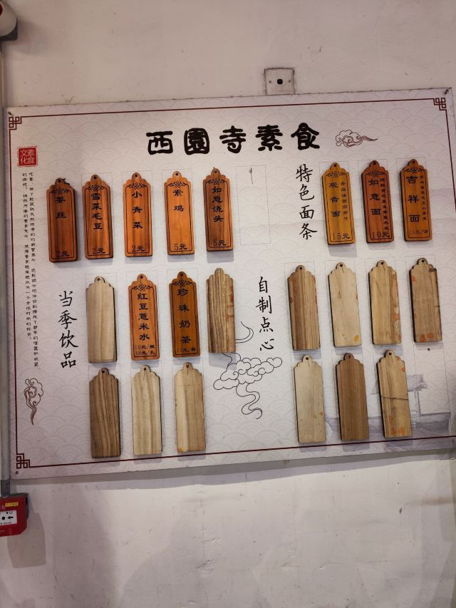 观音面,素包子,吉祥面,如意面,豆沙包,香菇,素鸡,菜包子,银耳羹,观音面浇头,素斋面,罗汉斋面,素食八宝饭,斋包,菠萝西米汤,定胜糕,炸面食,绿豆汤,酸梅汤,雪菜毛豆