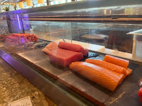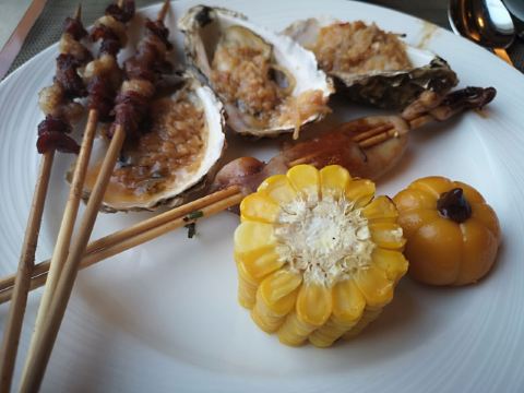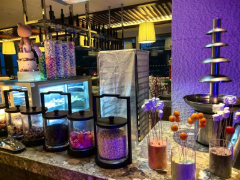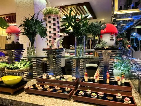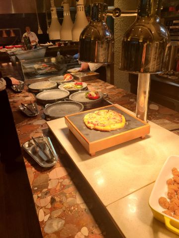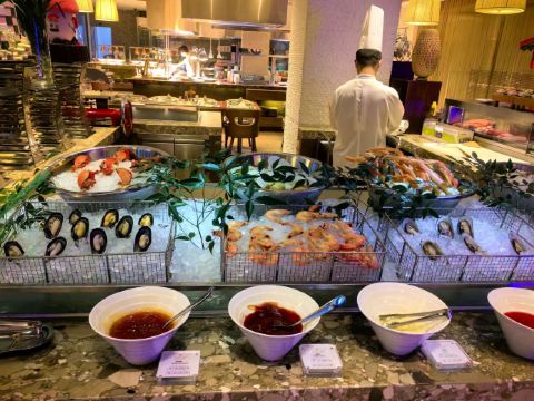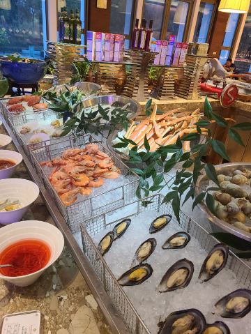 五点半准时到,可能是工作日,一开始人不多,有点包场的感觉❤️。直到订餐的时候才知道,金鸡湖大酒店的自助餐周一到周三是没有的。 菜品琳琅满目~喜欢三文鱼,所以吃了三轮。佛跳墙、海螺、象拔蚌、生蚝…都很新鲜!烤鱿鱼也很好吃,好大一串。 还有小火锅,不喜欢生吃的,还可以烫着吃。