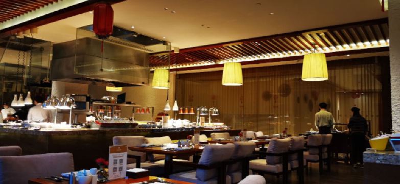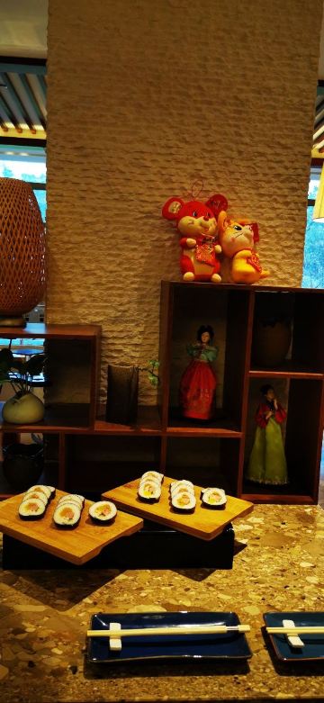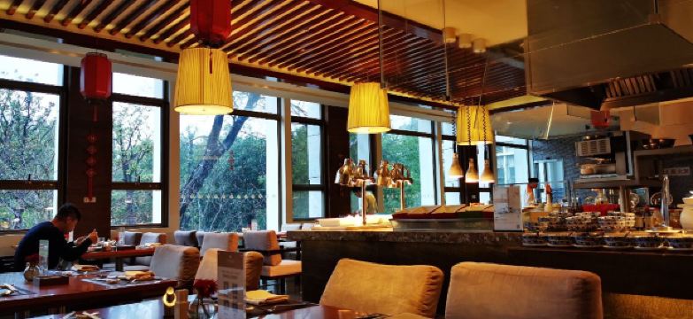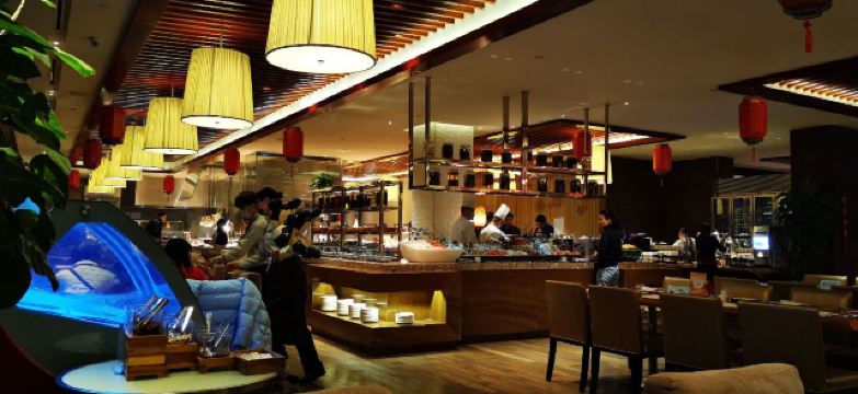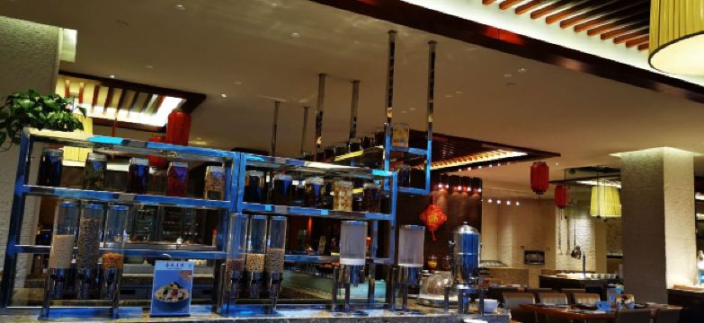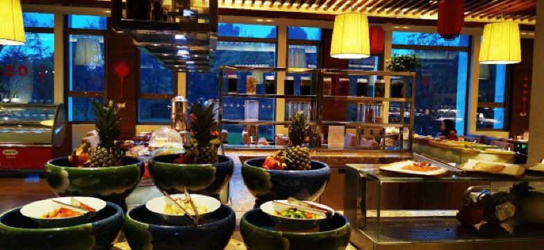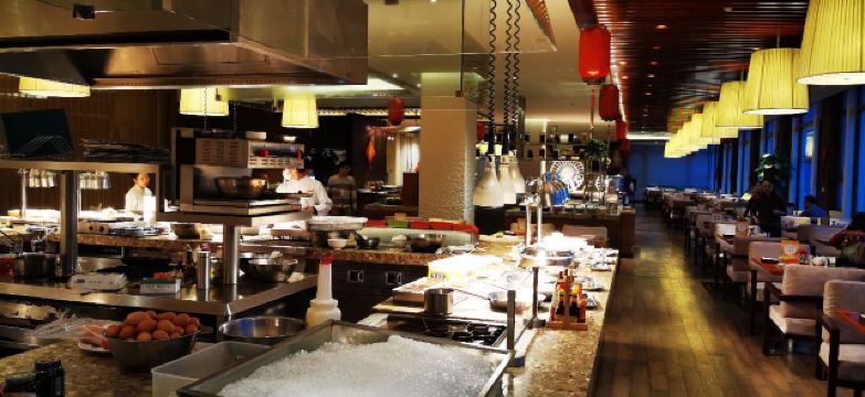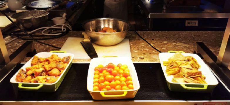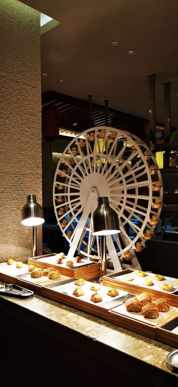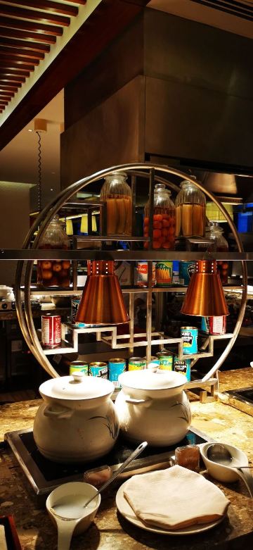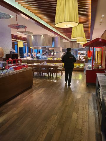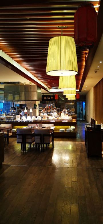 五星酒店的咖啡厅,一般情况下也是吃自助早餐和自助晚餐的地方,所以都会装饰的很大气,空间大,景色好,金鸡湖大酒店的金咖啡厅也是这样。这次从小年夜到初二住了四个晚上,每天早餐就是在这里吃的,六点半就开门了,可能过年人少些,我们七点半去人还不多。进门直接拿房卡在POS机上扫一下自动识别房号,靠窗的位子景观好,但是排列稍挤,进出不便,尝试坐了一次之后就果断换到靠近小馄饨摊位的桌子,不过晚餐不能坐这类位子,油烟大了些,还是靠窗位好。早餐选择品种异常多,中西式、面点、点心品种齐全,吃下来肉包子做的不错,煎饼果子刚出炉也很可口,咖啡最好自己去倒,咖啡机上可选的品类比较齐全。虽说是过年,但服务生配备齐全,没有人手不足的感觉