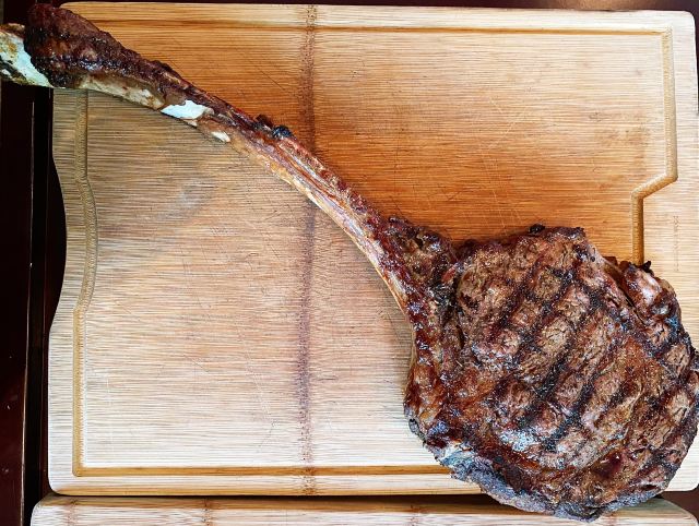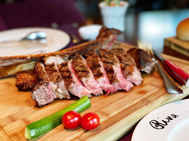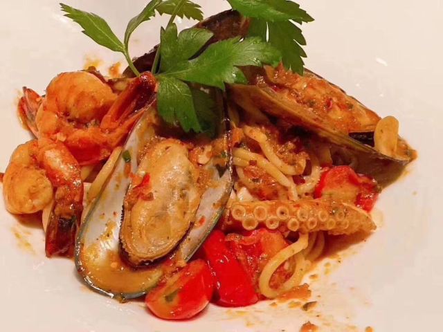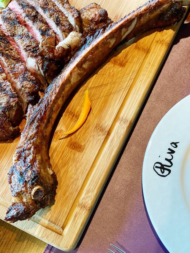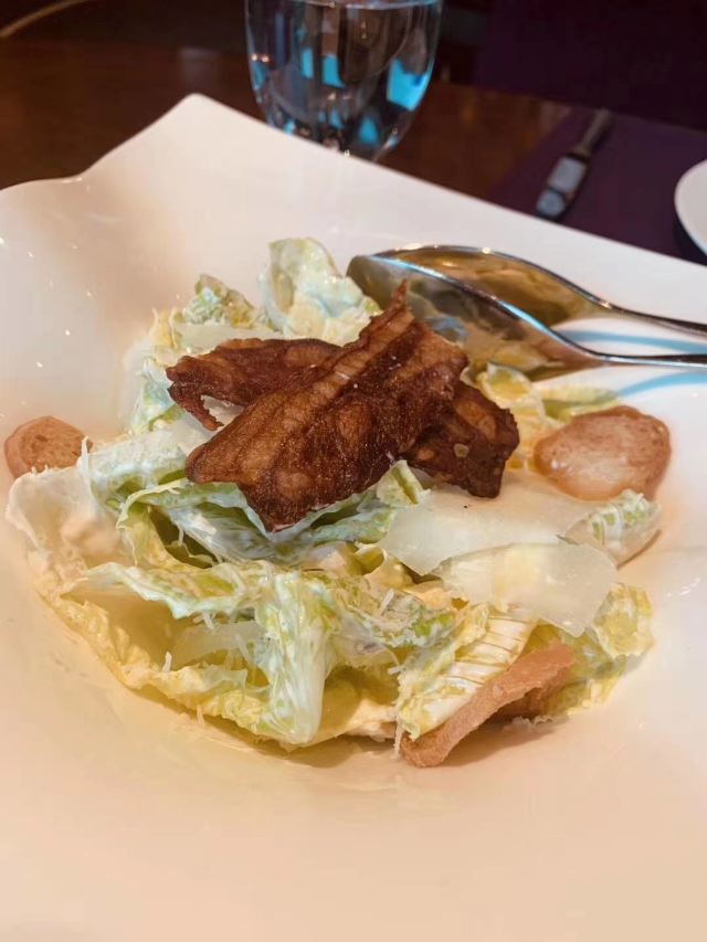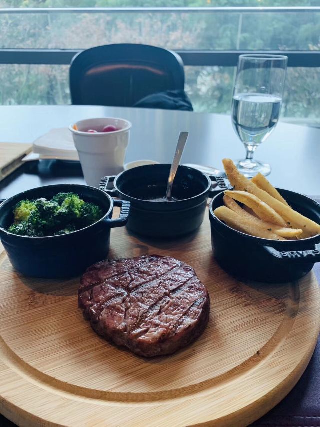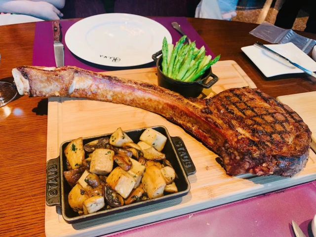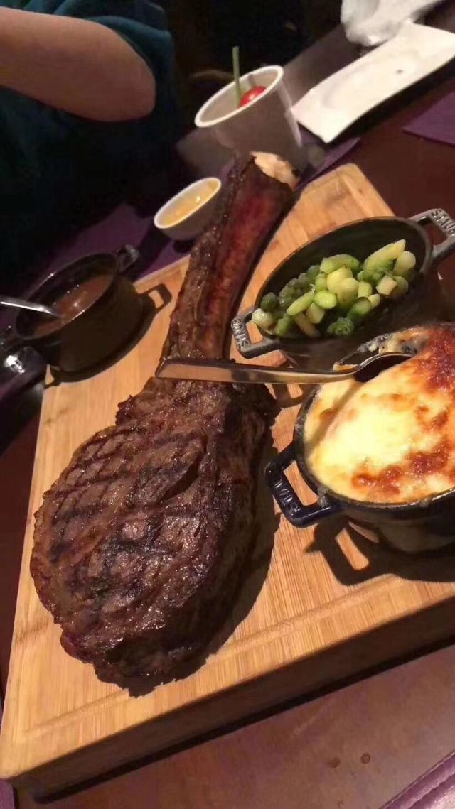 高星酒店里的扒房,环境肯定不差啊,完全可以放心,一定上档次的。服务也不必说,完全不用担心,有求必应。战斧牛排是这家店的招牌,拥有很多铁杆粉丝,牛排超大块,肉质丰满,生熟度根据个人喜好选择,稍不注意就吃撑了。