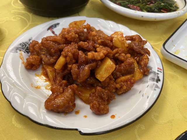 D了个Y大山里的农家菜 总有一些似曾相识的感觉 因为都不好找 基本都是靠网评跟口口相传吧 这边一个宅院里有两家农家菜 竞争不可谓不激烈 从车开到宅院的那刻起 门口就一直有人盯着 在哪家吃直接决定了你车停哪儿 从停车的情况来看 其实两家生意应该伯仲之间 不会差太多 农家菜嘛 农家风 尤其村里的 基本就是一个调调 两个人 让老板娘给随意配了一下 |红烧大鲳鱼^对 就是那种个头特别大的鱼 十足一整个大盆子 个头大 肉质倒是不柴不木 味道还不错 红烧很入味 拌饭一级棒 |农家草鸡汤^招牌吧 不管人多人少 反正汤得满满一锅 土鸡嚒 那个鲜啊 黄黄一层油 漂出一阵香 老狼爱吃鸡的既视感 有木有 鸡肉炖的很酥嫩 口感不错 |盐水太湖白虾^最普通 最家常 最本味的吃法 应该也是最合时宜 最能品出食材本身鲜味的吃法 综评 农家菜就是来吃个味道 环境啥的都是其次 从口味上来说 还不错 价格也不贵 菜都很下饭 推荐了