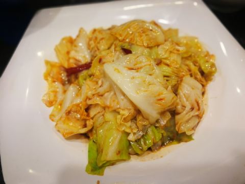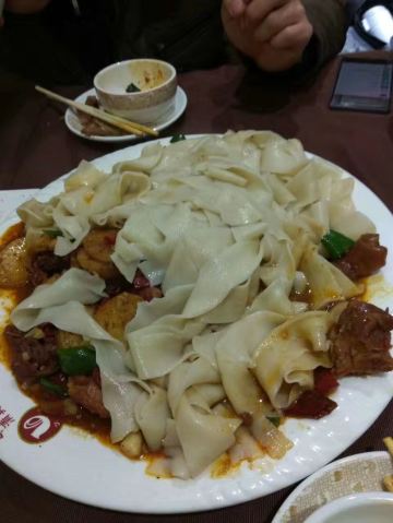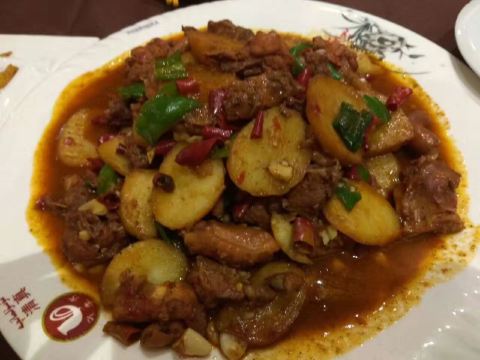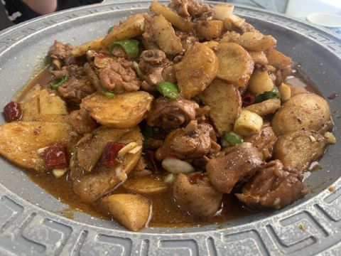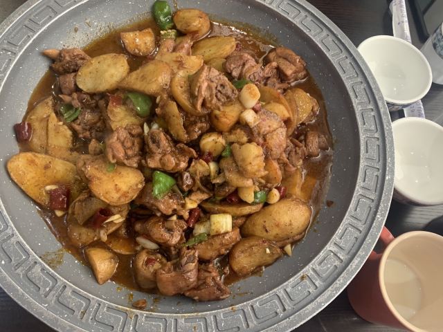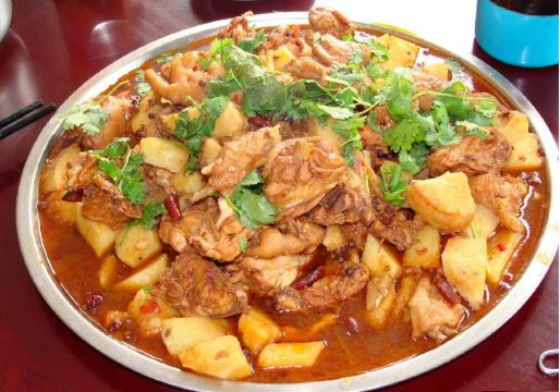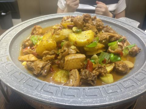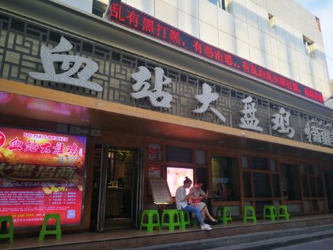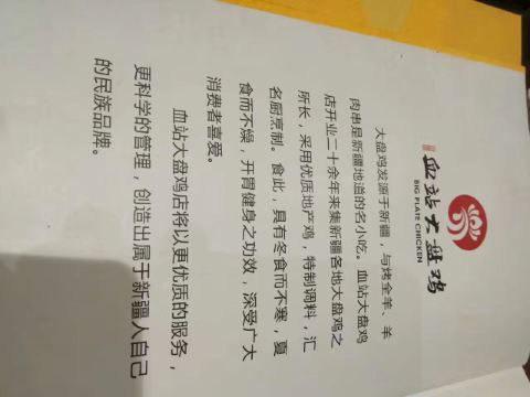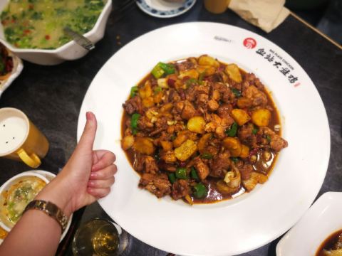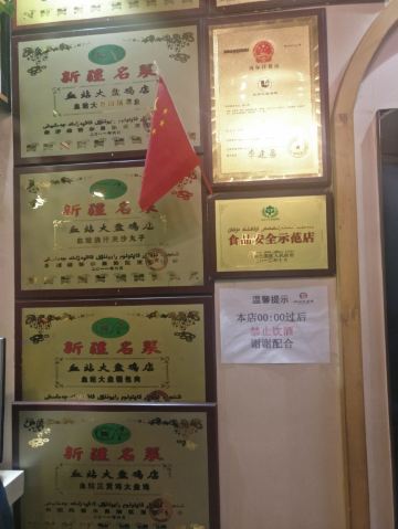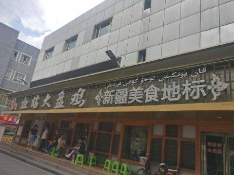 在乌鲁木齐停留的时间有限,我们把唯一的一顿正餐放在了血战大盘鸡(西北路店)。   其实没行李的话,挺想体验一下乌市的公交的。但每人一个大箱子,只能打车了。他家在主干道上,还挺方便的。   [环境] 门面挺显眼,门口有很多等位用的凳子,看来人气向来很旺。一楼的墙上挂满了他家的各种荣誉,很多新疆名菜得到了自治区烹饪协会的认可。   一楼的卡座装饰带着浓浓的穆斯林风情,墙上胡杨林的照片更是让人神往。我们人多,直接被带到了地下室的卡座。   我们买了团购套餐,又点了几个菜,就很丰盛了。   |中盘三黄鸡^。几乎桌桌必点的招牌菜,中盘就已经很大了。鸡肉挺嫩的,微微麻,微微辣,吃起来很过瘾。不过我偏爱土豆多一点,大块的,粉粉糯糯,超满足啊!再拌上两份薄薄滑滑又有韧性的|皮带面^,感觉一个菜就能吃饱!   |小羊肚^。小羊肚是辣炒的,口感挺不错,脆嫩又不失韧性,但对我来说太辣了。 牛肉大杂烩,38。这个杂烩真的挺杂的。白菜、木耳、粉丝、豆腐……牛肉倒是不多。味道的话,也很辣!   |炝莲白^。这个菜名很好听,上来之后发现其实就是炝炒包心菜,不过味道挺好的。 |石河子凉皮^。新疆名小吃,配黄瓜丝、豆芽、面筋、香菜。浸润在红油里,很是诱人。口感非常爽滑,如果不是那么辣的话,我会很喜欢的。   |养生青菜钵^。这个菜卖相一般,但在吃了各种辣各种肉之后,大家都觉得这青菜钵好吃极了,清爽解腻,暖暖的很舒服。   |卡瓦斯^。虽然听说过,但从来没喝过这种饮料。新疆的餐厅却几乎家家都卖这个,或自己制作,或批发再零售。琥珀色的液体看着就很诱人,带着特殊的酒花芬芳,酸甜适中,喝了一口就爱上了。   |红柳烤肉串^。来新疆必吃系列之一,羊肉串。肥瘦比例恰当,油润度很好,美味!和卡瓦斯很配哦。   |红乌苏^。羊肉串当然也配夺命乌苏,哈哈哈。喝酒的小伙伴大概晚上在火车上睡得比较香吧。 |酸奶^。推荐!推荐!饱饱的吃完一餐后,再来杯自制的酸奶,中和一下口腔里的油和辣,感觉实在是太爽了!