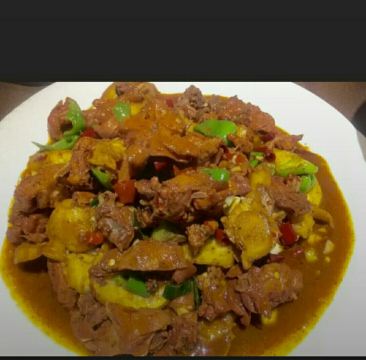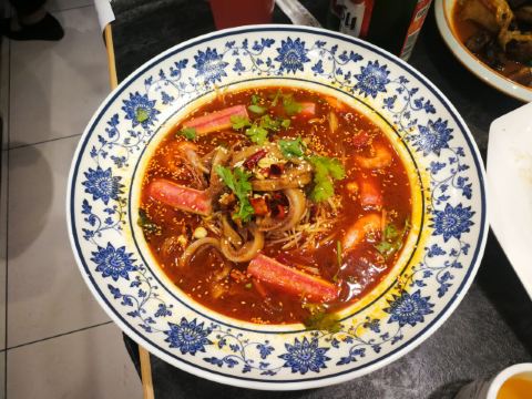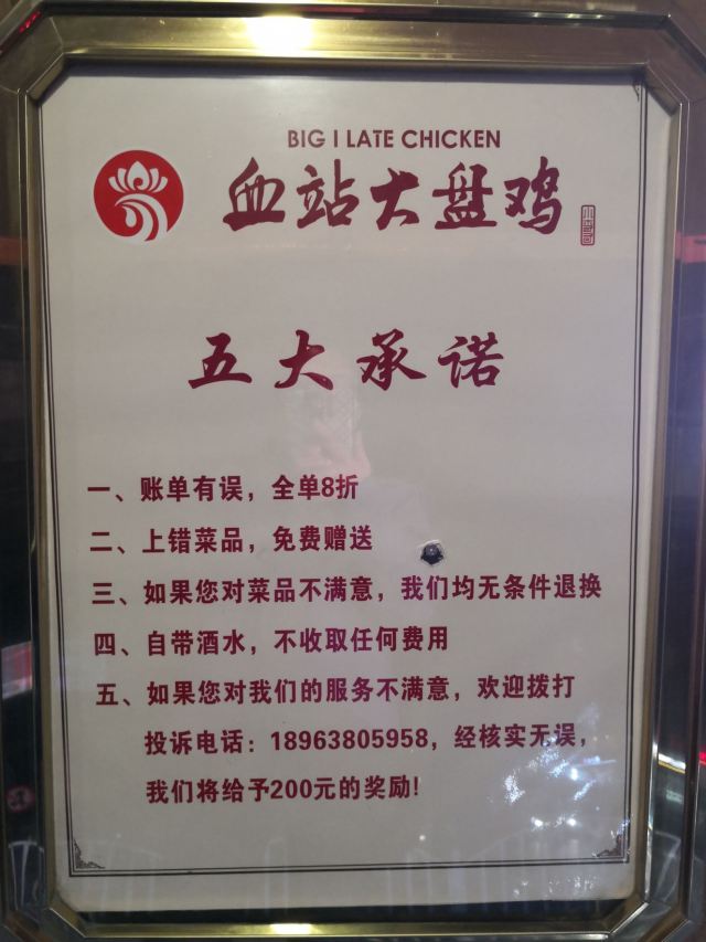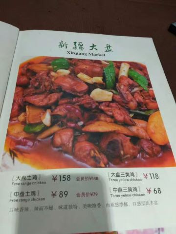 雨中之苇在乌鲁木齐停留的时间有限,我们把唯一的一顿正餐放在了血战大盘鸡(西北路店)。   其实没行李的话,挺想体验一下乌市的公交的。但每人一个大箱子,只能打车了。他家在主干道上,还挺方便的。   [环境] 门面挺显眼,门口有很多等位用的凳子,看来人气向来很旺。一楼的墙上挂满了他家的各种荣誉,很多新疆名菜得到了自治区烹饪协会的认可。   一楼的卡座装饰带着浓浓的穆斯林风情,墙上胡杨林的照片更是让人神往。我们人多,直接被带到了地下室的卡座。   我们买了团购套餐,又点了几个菜,就很丰盛了。   |中盘三黄鸡^。几乎桌桌必点的招牌菜,中盘就已经很大了。鸡肉挺嫩的,微微麻,微微辣,吃起来很过瘾。不过我偏爱土豆多一点,大块的,粉粉糯糯,超满足啊!再拌上两份薄薄滑滑又有韧性的|皮带面^,感觉一个菜就能吃饱!   |小羊肚^。小羊肚是辣炒的,口感挺不错,脆嫩又不失韧性,但对我来说太辣了。 牛肉大杂烩,38。这个杂烩真的挺杂的。白菜、木耳、粉丝、豆腐……牛肉倒是不多。味道的话,也很辣!   |炝莲白^。这个菜名很好听,上来之后发现其实就是炝炒包心菜,不过味道挺好的。 |石河子凉皮^。新疆名小吃,配黄瓜丝、豆芽、面筋、香菜。浸润在红油里,很是诱人。口感非常爽滑,如果不是那么辣的话,我会很喜欢的。   |养生青菜钵^。这个菜卖相一般,但在吃了各种辣各种肉之后,大家都觉得这青菜钵好吃极了,清爽解腻,暖暖的很舒服。   |卡瓦斯^。虽然听说过,但从来没喝过这种饮料。新疆的餐厅却几乎家家都卖这个,或自己制作,或批发再零售。琥珀色的液体看着就很诱人,带着特殊的酒花芬芳,酸甜适中,喝了一口就爱上了。   |红柳烤肉串^。来新疆必吃系列之一,羊肉串。肥瘦比例恰当,油润度很好,美味!和卡瓦斯很配哦。   |红乌苏^。羊肉串当然也配夺命乌苏,哈哈哈。喝酒的小伙伴大概晚上在火车上睡得比较香吧。 |酸奶^。推荐!推荐!饱饱的吃完一餐后,再来杯自制的酸奶,中和一下口腔里的油和辣,感觉实在是太爽了!
