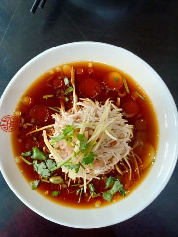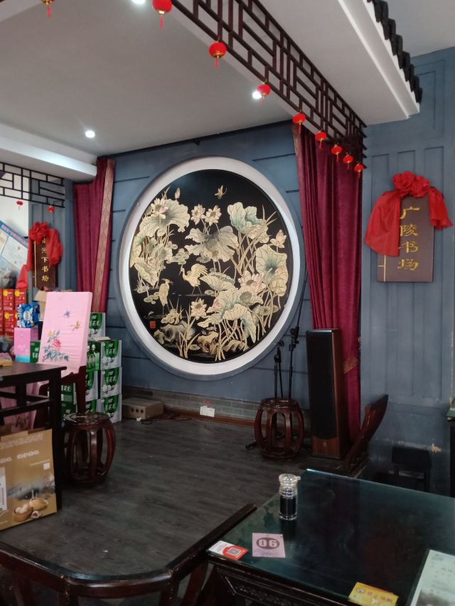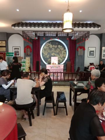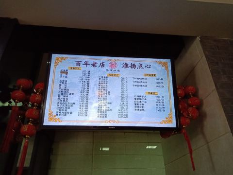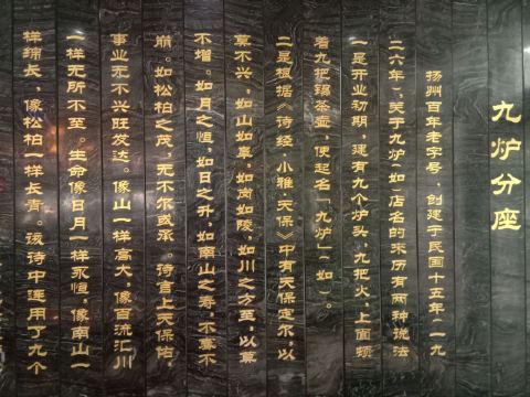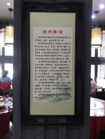 游览何园,错过了饭点儿,顺脚就走到了这里。招牌很显亮,名字也起的好啊,高端大气,不愧是百年老店。这里有广陵书场,只是现在不是表演时间,想来边吃边赏,推杯换盏,且茶且酒,觥筹交错,也是人生一大趣事。我们选了一个靠窗的位置,沙发座,人不多,点了两人餐,坐等送餐,上菜速度很快。扬州炒饭,好歹也是扬州美食的招牌菜,30块,两人量,一看就不是新做的,卖相不好,略有糊味儿,米粒也没有饱满剔透的感觉,就是非常非常家常的味道,饿了,也不想那么多,要什么自行车啊文思豆腐羹,论盅卖,两盅起,12块,烫烫的,吃不大出什么味道来,就是调料的鲜,溜溜炒饭也不错。烫干丝,小份儿,6块,汤汁齁齁咸,干丝还可以,拌吧拌吧就着炒饭一起下去了。不管怎么说,吃饱了,又坐着休息了好大一会儿,走了。