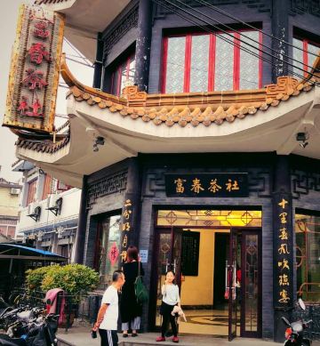 始创于1885年,为扬州三春之首(三春为富春茶社、冶春茶社、共和春茶社,是老扬州有名的三座茶楼)。民间有语,到扬州必到富春。客人入座,各色招牌茶点闪亮登场,三丁包、千层油糕、翡翠烧卖,咀嚼的同时呷一口富春特制“魁龙珠”茶,个中鲜美滋味不言而喻。