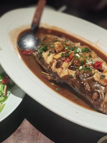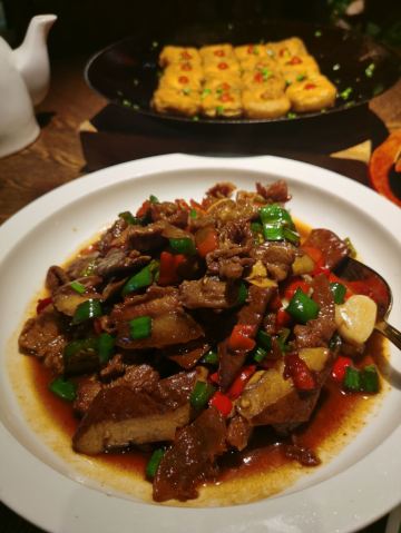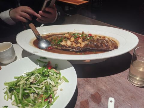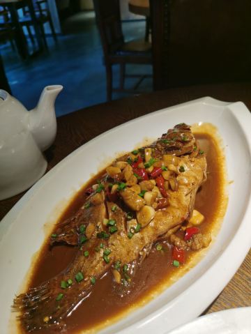 开心就好灬这家徽菜馆就在黄山国际饭店旁边,人气还是很高的,环境古色古香,点菜都是在菜品区当场看当场点 红烧臭鳜鱼,来黄山怎么能不吃一次正宗的臭鳜鱼呢,要了小份的,七八两重,这道菜真的是闻着臭吃起来奇香无比,鱼肉很紧实,口感没话说,蘸点汤汁更好吃 黄山老母鸡汤,鸡肉还不错,但是感觉还能炖更久点,汤头是特别鲜,小心别烫着,放了半小时再喝一碗还是温热的 铁板毛豆腐也是一道地方特色菜,上面是辣酱,口味其实还可以,但是这种粉粉的感觉,我实在是有点不习惯 超级老妈小炒,这个很大一份,炒得特别入味,和臭鳜鱼一样,都是下饭好菜 徽菜属于八大菜系之一,偏重口味,这家店从环境到口感还是非常值得尝试一下的