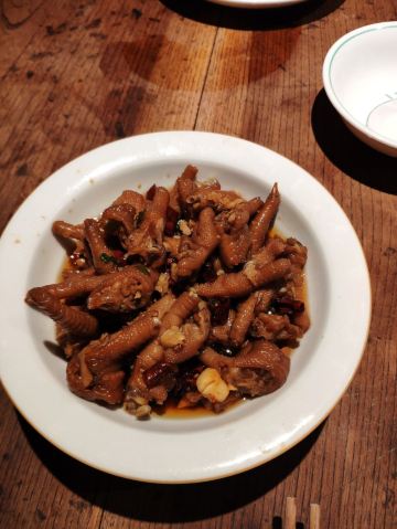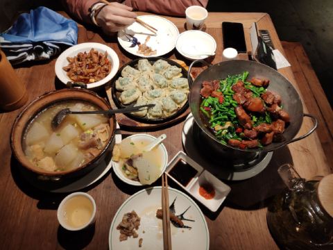 HUANG SHAN LAO MA看美食林的推荐来的,当真不虚此行。店面装修很有特色,点菜方式也让人大开眼界!我们两个人点了四个菜,泡椒鸡爪好吃极了,相当开胃,红烧肉太好吃了,本来我是不吃肥肉的,可是这个真的肥的比瘦的更好吃啊,入口即化,恨不得舌头都吞掉!煎饺最受老公喜爱,火腿冬瓜汤也是用料足足的,作为北方人能吃上一顿这么合口味的饭也是很惊喜了,老公是对吃没有追求的人,平时吃什么都是还凑合,这次破例夸我选的馆子不错,好开心啊!