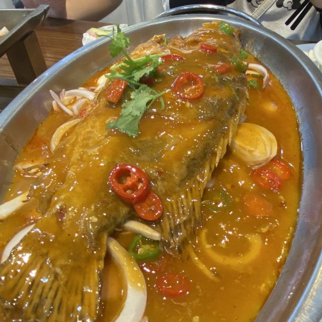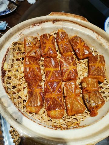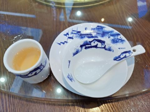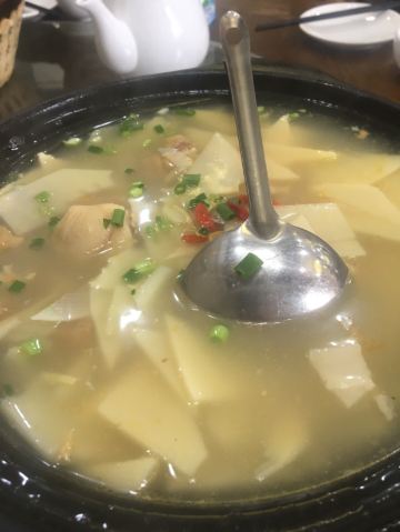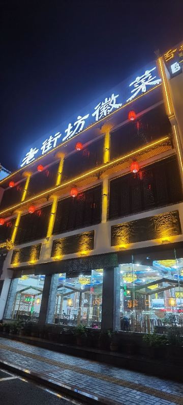 到黄山的第一顿晚餐,翻看了好多评价订的这家“老街坊”,离名宿也很近,步行5分钟就到了。 餐厅在路口一整幢3层楼建筑,徽派风格的装修,进门右手边就是点餐区,有砂锅土灶、明档、家常菜牌等“所见即所得”的菜品,因为我们是团购的套餐,所以这一环节没有过多体验。 左侧是大厅区,座位很多,吊顶是蓝天白云的设计,餐具是蓝色调的徽派建筑景色,让人很是心情愉悦和放松!服务员给我们安排了一张大圆桌,下单后没多久就陆续上菜了,效率是真的高!! 石耳炒蛋(48):黄山的“双石”之一——石耳。原以为是“地衣”类的食品,正好被服务员听到了,然后立马给我们“科普”两者的区别:地衣生长于雨后的石板石缝中,石耳生长于悬崖峭壁的石缝中,营养价值和市场价值也不同。 石耳炒蛋是比较经典的做法,有养心安神,补血,滋阴润燥的功效,适宜多种人群食用呢。加了大葱叶和红椒后,整盘菜色香味俱全! 新安小鲜虾(78):概念中的“新安江”是淳安至建德段的水系,这次做了黄山的攻略以后才知道,黄山才是新安江的水源地!鱼米之乡的江南,也盛产江河鱼鲜,用新安江的河虾做的葱油爆虾,味道真的是绝绝子~~~~~~~~ 秘制臭鳜鱼(118):来黄山必尝的臭鳜鱼,大小在一斤左右,鱼肉鲜嫩,说是“臭”鳜鱼,但其实只是古时候流传下来的保存鱼鲜的做法,加工后基本没有异味,就想臭豆腐和榴莲的性质,闻着臭吃着香! 笋干烧肉(58):也是黄山的家常菜之一,五花肉切小块,与腊笋在大锅里炖,笋的清香和肉香互相糅合,下酒下饭皆适宜。 明炉毛豆腐(38):毛豆腐是用食用菌丝培育出来的,实物有点辣眼睛,但徽州人用毛豆腐制菜后,保证让吃货们欲罢不能!炸着吃,蘸酱吃原味;炖着吃,加入各种佐味,吃鲜香。 竹荪菌王煲(68):竹荪与各种菌类炖汤,即便没有放调料,依旧能鲜出天际!店家竟然还有免费续高汤的服务,太过惊喜! 时令蔬菜(18):清炒青菜,大鱼大肉之后如同甘霖般爽口。烹饪的火候恰到好处,菜已断生,色仍碧绿! 整个用餐过程都很愉悦,因为服务员全程会把服务做在我们的需求之前——开水烫餐具、及时加茶水,甚至连我们喝酒后还主动递给我们一份炒花生~~~~~~~~真的太爱这家店了,安利给小伙伴们!