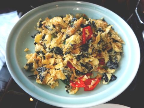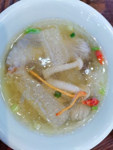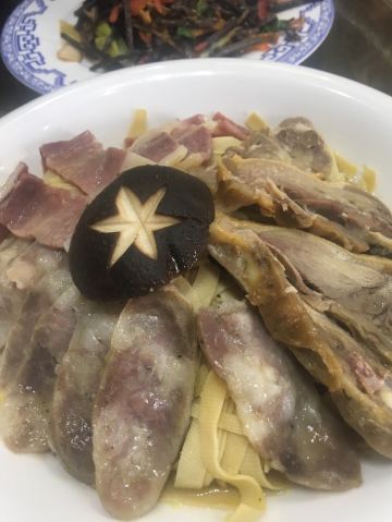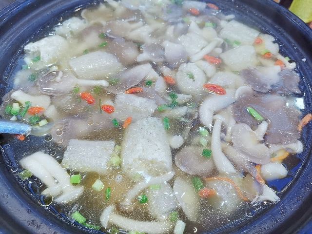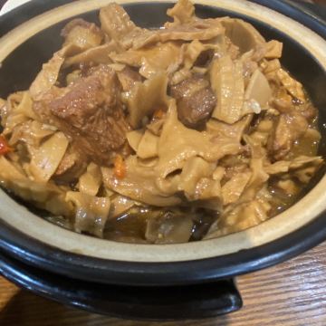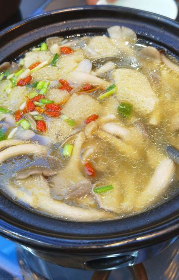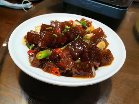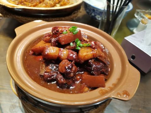 xxy259到黄山的第一顿晚餐,翻看了好多评价订的这家“老街坊”,离名宿也很近,步行5分钟就到了。 餐厅在路口一整幢3层楼建筑,徽派风格的装修,进门右手边就是点餐区,有砂锅土灶、明档、家常菜牌等“所见即所得”的菜品,因为我们是团购的套餐,所以这一环节没有过多体验。 左侧是大厅区,座位很多,吊顶是蓝天白云的设计,餐具是蓝色调的徽派建筑景色,让人很是心情愉悦和放松!服务员给我们安排了一张大圆桌,下单后没多久就陆续上菜了,效率是真的高!! 石耳炒蛋(48):黄山的“双石”之一——石耳。原以为是“地衣”类的食品,正好被服务员听到了,然后立马给我们“科普”两者的区别:地衣生长于雨后的石板石缝中,石耳生长于悬崖峭壁的石缝中,营养价值和市场价值也不同。 石耳炒蛋是比较经典的做法,有养心安神,补血,滋阴润燥的功效,适宜多种人群食用呢。加了大葱叶和红椒后,整盘菜色香味俱全! 新安小鲜虾(78):概念中的“新安江”是淳安至建德段的水系,这次做了黄山的攻略以后才知道,黄山才是新安江的水源地!鱼米之乡的江南,也盛产江河鱼鲜,用新安江的河虾做的葱油爆虾,味道真的是绝绝子~~~~~~~~ 秘制臭鳜鱼(118):来黄山必尝的臭鳜鱼,大小在一斤左右,鱼肉鲜嫩,说是“臭”鳜鱼,但其实只是古时候流传下来的保存鱼鲜的做法,加工后基本没有异味,就想臭豆腐和榴莲的性质,闻着臭吃着香! 笋干烧肉(58):也是黄山的家常菜之一,五花肉切小块,与腊笋在大锅里炖,笋的清香和肉香互相糅合,下酒下饭皆适宜。 明炉毛豆腐(38):毛豆腐是用食用菌丝培育出来的,实物有点辣眼睛,但徽州人用毛豆腐制菜后,保证让吃货们欲罢不能!炸着吃,蘸酱吃原味;炖着吃,加入各种佐味,吃鲜香。 竹荪菌王煲(68):竹荪与各种菌类炖汤,即便没有放调料,依旧能鲜出天际!店家竟然还有免费续高汤的服务,太过惊喜! 时令蔬菜(18):清炒青菜,大鱼大肉之后如同甘霖般爽口。烹饪的火候恰到好处,菜已断生,色仍碧绿! 整个用餐过程都很愉悦,因为服务员全程会把服务做在我们的需求之前——开水烫餐具、及时加茶水,甚至连我们喝酒后还主动递给我们一份炒花生~~~~~~~~真的太爱这家店了,安利给小伙伴们!