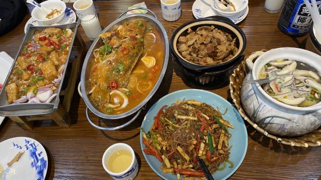 秘制臭鳜鱼,虎皮毛豆腐,笋尖烧肉,牛腩锅巴,石耳炒蛋,干锅茶树菇,蕨菜,明炉毛豆腐,腊味鲜笋煲,香煎葛粉皮,跳水鱼,铁板土豆粉,冬笋肉片,野菜马兰头,臭鳜鱼,毛豆腐