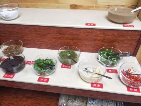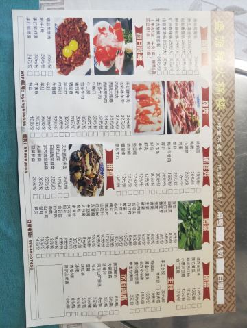 西旗羊肉,百叶毛肚拼,肥牛,鸭血,黄油牛胸口,野生蘑菇,羊肉卷,手切鲜羊肉,烤腰子,鲫鱼,五花肉金针菇,木桶豆腐,鸡心,烤羊排,烤茄子,韭菜,牛板筋,羊肉串