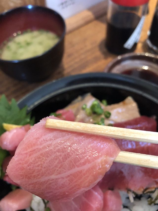 真的很好吃。金枪鱼非常肥嫩!两种口味的酱油用于蘸刺身和拌饭,金枪鱼肉无论是刺身、炙烤,还是用勺子从鱼皮上刮下来的,都非常美味!