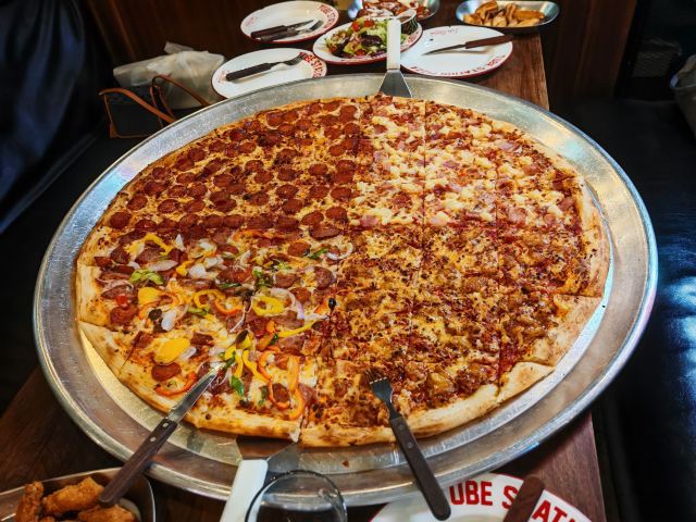 位置就在省府前街步行街中部,比邻芙蓉街,环境清幽,适合打卡拍照。店内是简易工业风,比较宽敞。 四个人不知天高地厚的点了32寸披萨,吃不完,根本吃不完,建议至少六人以上吃。披萨味道不错,十种口味当中选四种,可惜没有榴莲口味。小食味道一般,中规中矩。晚上9点半就清客打烊,有点小遗憾。