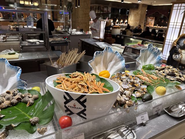 炭烤生蚝,迷迭香煎法式羊排,美式炙烤牛肩胛,脆皮烤鸭,老济南烤串,冷锅串串,三文鱼,烤羊排,冰激凌,榴莲千层蛋糕,自助餐,西式甜点,生鱼片