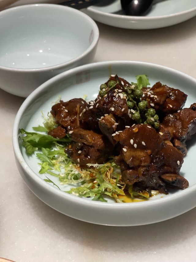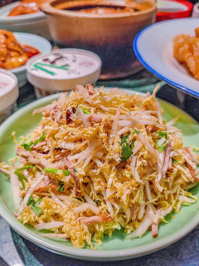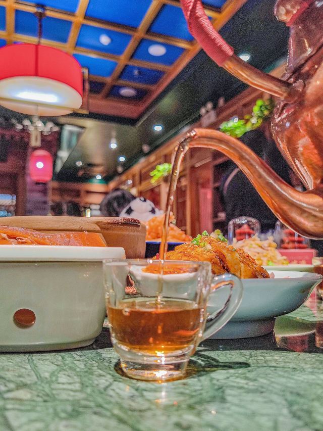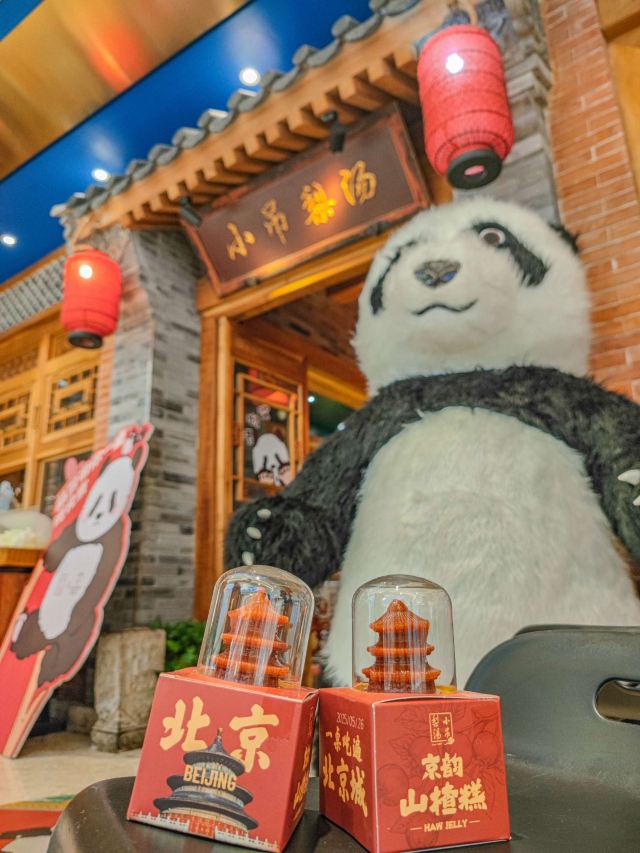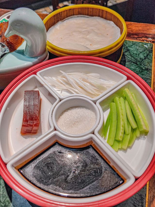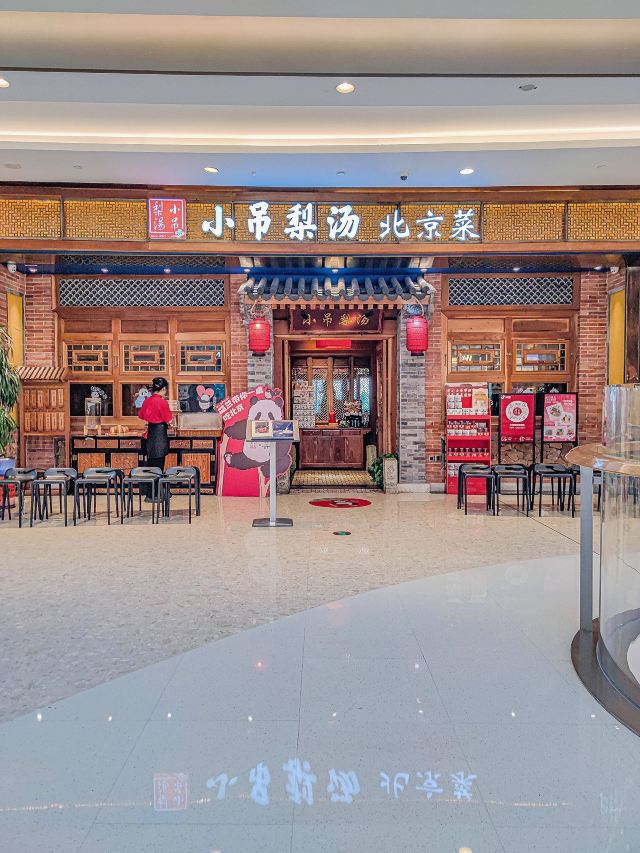 在济南想吃口地道北京菜?万象城这家真的可以冲! 🌿环境氛围: 一进门,木质隔断配着复古灯笼,墙上挂着京味儿插画,瞬间穿越到北京胡同里的小馆子。灯光是暖色黄光,不会太亮晃眼,桌间距也宽,聊天吃饭都很自在,除了大厅方桌外,还有卡座。 菜品必点: 茉莉烤鸭:刚出炉的烤鸭油亮亮的,师傅当场片好,鸭皮薄,蘸一勺白糖入口,简直了。卷饼也很绝,很薄却不容易破,裹上葱丝、黄瓜和甜面酱,一口下去一点儿也不腻。 梨球果仁虾:梨球炸得外脆里嫩,咬开全是清甜汁水,大虾个头不小,外壳酥,能直接嚼。 传统小吊梨汤:每桌必点!梨汤每天凌晨4:00现熬,熬得稠稠的,梨肉都炖化了,喝得到细腻的果肉纤维,还飘着淡淡的桂花香,甜度刚刚好。 服务员都很贴心,在济南能吃到这么地道的京味儿,真的太棒了,性价比很可以。 凭学生证和到京旅游票证,到店可以领周边。