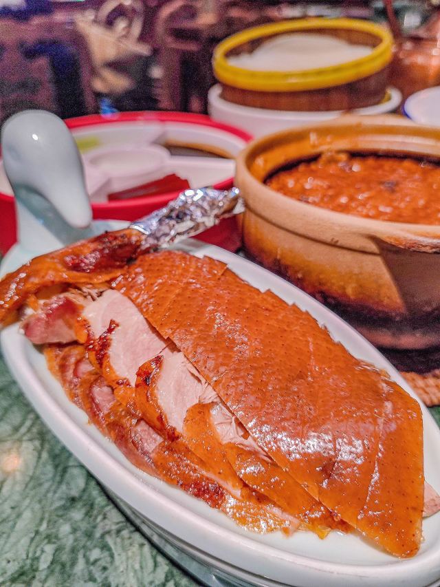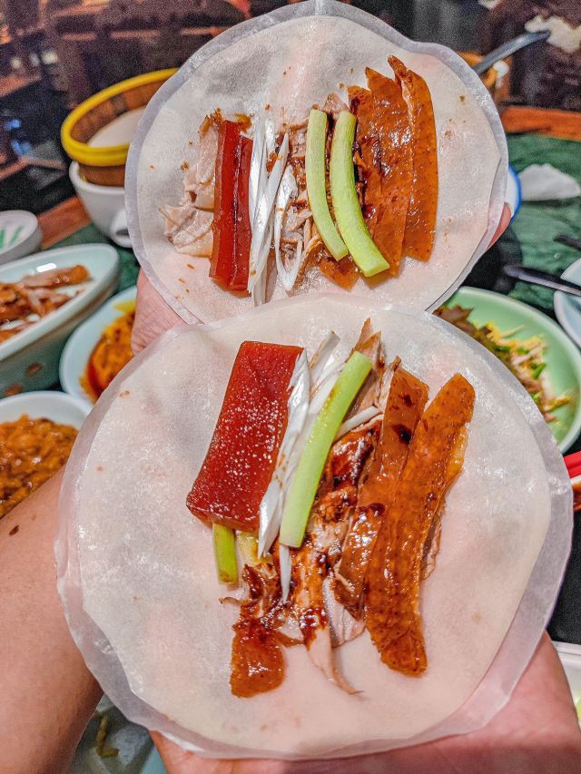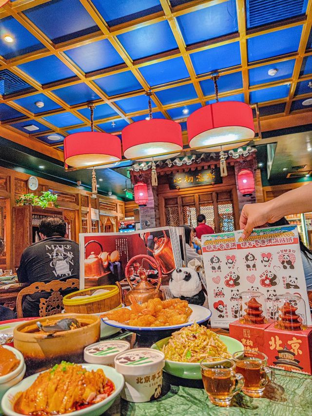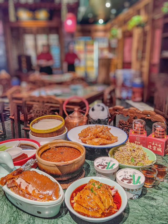 wtdwxd在济南想吃口地道北京菜?万象城这家真的可以冲! 🌿环境氛围: 一进门,木质隔断配着复古灯笼,墙上挂着京味儿插画,瞬间穿越到北京胡同里的小馆子。灯光是暖色黄光,不会太亮晃眼,桌间距也宽,聊天吃饭都很自在,除了大厅方桌外,还有卡座。 菜品必点: 茉莉烤鸭:刚出炉的烤鸭油亮亮的,师傅当场片好,鸭皮薄,蘸一勺白糖入口,简直了。卷饼也很绝,很薄却不容易破,裹上葱丝、黄瓜和甜面酱,一口下去一点儿也不腻。 梨球果仁虾:梨球炸得外脆里嫩,咬开全是清甜汁水,大虾个头不小,外壳酥,能直接嚼。 传统小吊梨汤:每桌必点!梨汤每天凌晨4:00现熬,熬得稠稠的,梨肉都炖化了,喝得到细腻的果肉纤维,还飘着淡淡的桂花香,甜度刚刚好。 服务员都很贴心,在济南能吃到这么地道的京味儿,真的太棒了,性价比很可以。 凭学生证和到京旅游票证,到店可以领周边。
