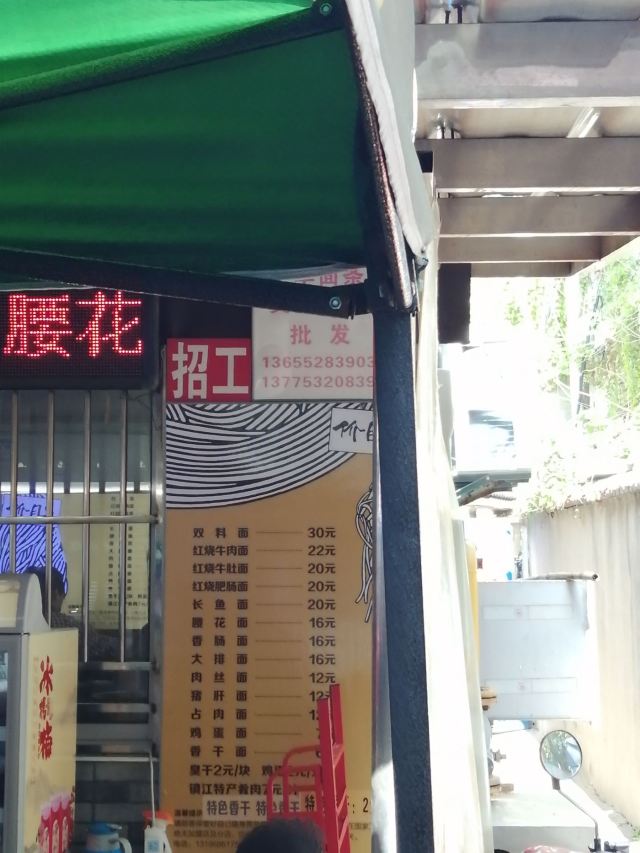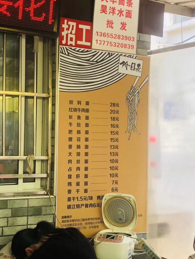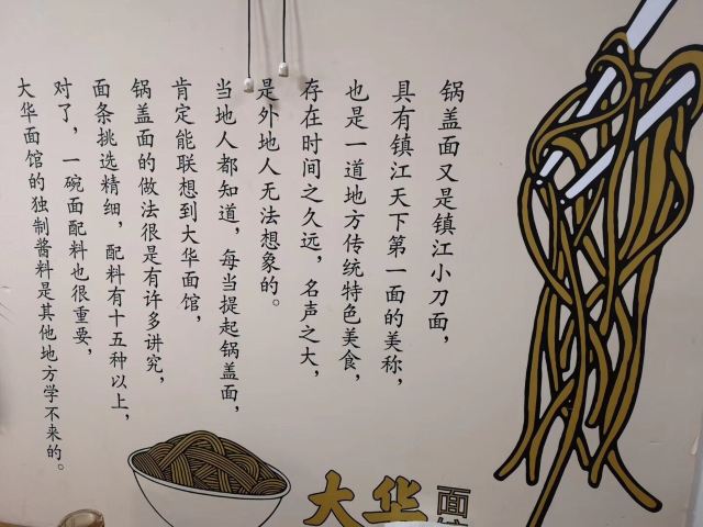 镇江锅盖面,腰花面,双料面,肴肉,肉丝面,大排面,红烧牛肉面,肥肠面,占肉面,长鱼面,牛肚面,油条,小刀面,水晶肴肉