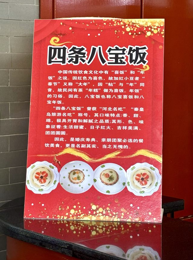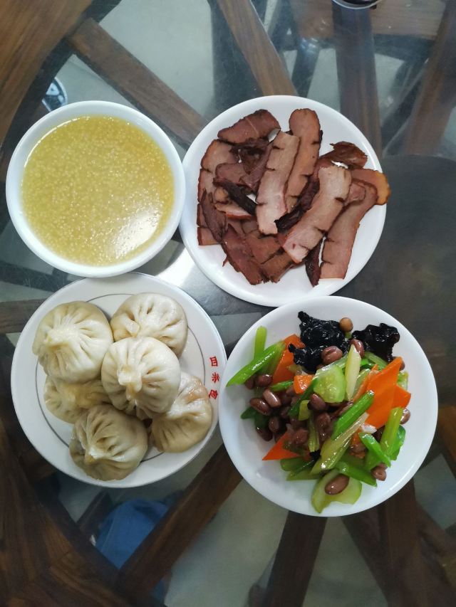 包子,肉皮冻,酱牛肉,皮蛋豆腐,叉烧肉,小米粥,花生菠菜,黄瓜豆腐丝,鸡蛋汤,八宝饭,桲椤叶饼