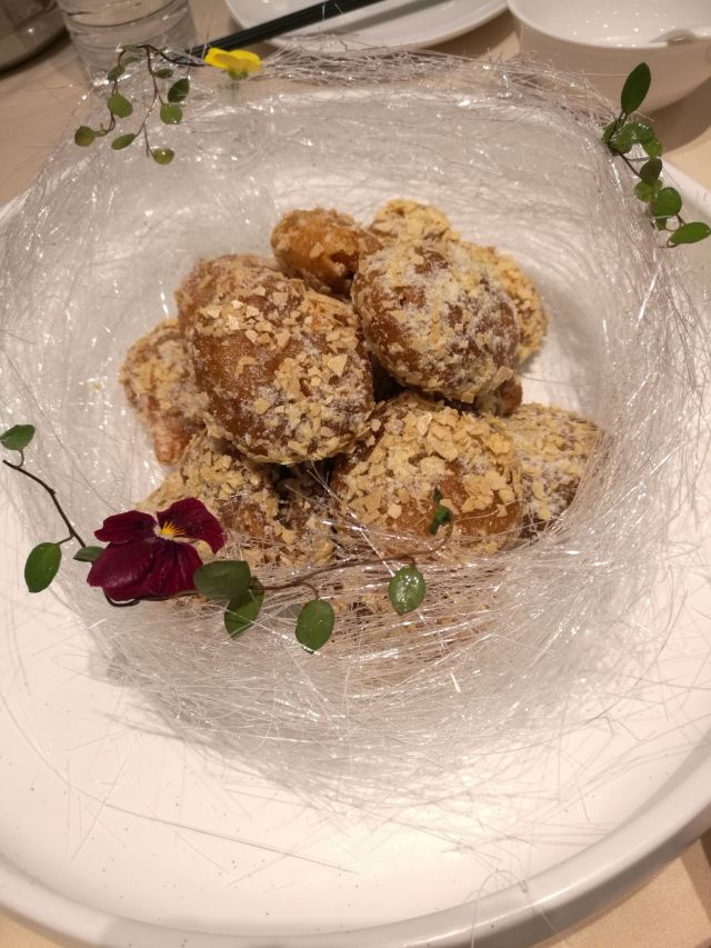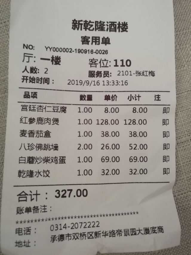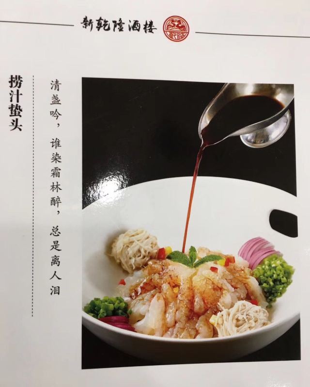 YoYo_0S9G2F5Y来之前看了好多美食攻略,无一不提及新乾隆酒楼,正好酒店就在旁边,放下行李立刻来品尝,总体感觉——咸~~ 作为口重的地道东北人,能让我觉的咸的是真的咸。之前看网上评论很多人都说菜咸,还觉得是不是有点夸张,亲身体验后才发现是真的很实事求是,几个菜吃下来,只记得杏仁豆腐点的清爽好吃。 红参鹿肉煲咸、白蘑炒柴鸡蛋咸、八珍佛跳墙(素)齁咸~~本来吃了几个咸的菜,想来盅滋补汤清清口,结果更咸。麦香茄盒不咸了,但是齁甜~~相比较乾隆饺子算正常了,不过因为是后上的,我也不知道是咸过劲了感觉不出来,还是本来就算清淡。值得一提的是配饺子的蒜很好吃,有点像糖蒜也有点像腊八蒜,总之很不错。 虽然调味上有些遗憾,但菜品、做法还是很有地方特色的,酒楼的服务也尤其好,服务员很热情主动,服务意识很好。 总之,作为特色新乾隆还是值得体验的,只是在点菜后服务员问忌口时记得提醒:“请做的稍微清淡点,少放盐,谢谢!”