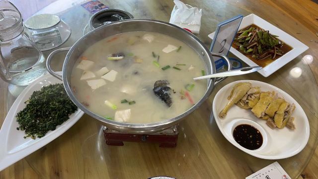 一家人去青山湖风景区游玩了一上午,真的是避暑胜地,凉快的很。 [薄荷]环境: 附近一排都是农家菜为主,因为是第一次去青山湖也不知道哪家菜平价又是地地道道的农家菜,所以就选择这家野鱼馆。 |青山湖鱼头煲^不得不说这锅鱼头汤是这桌菜的标杆菜,真的如果是我一个人去的话我可以单点这鱼头汤就炫炫到饱了。 |白切鸡^白切鸡的话也不像有些地方鸡肉柴柴的,小孩子咬不动。 最后总结一下,下次来的话还是会选择这家野鱼馆的菜的,因为孩子他吃不了辣,总之就是会来吃第二次的。
