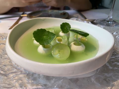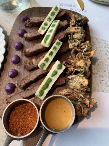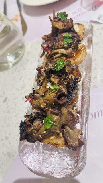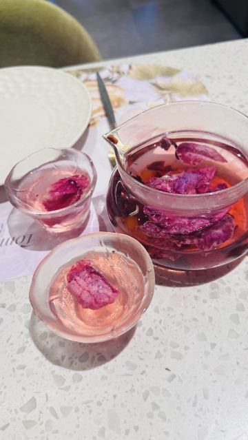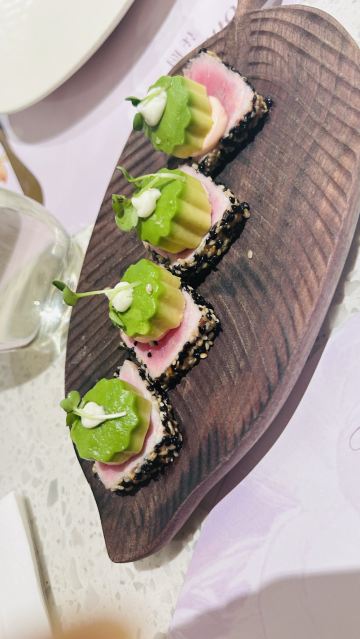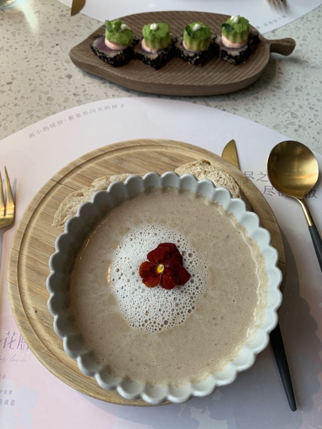 轻煎金枪鱼塔,蜂蜜烤南瓜沙拉,香草烤三黄鸡,香煎菲力牛排,荷塘月色葡萄乌龙冻 ,花厨特色菌菇汤,蓝蝴蝶,寿喜烧牛肉意面 ,螺肉,葡萄乌龙冻