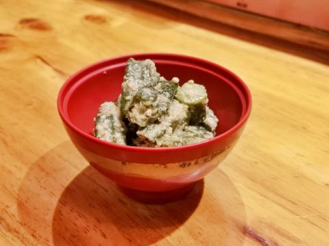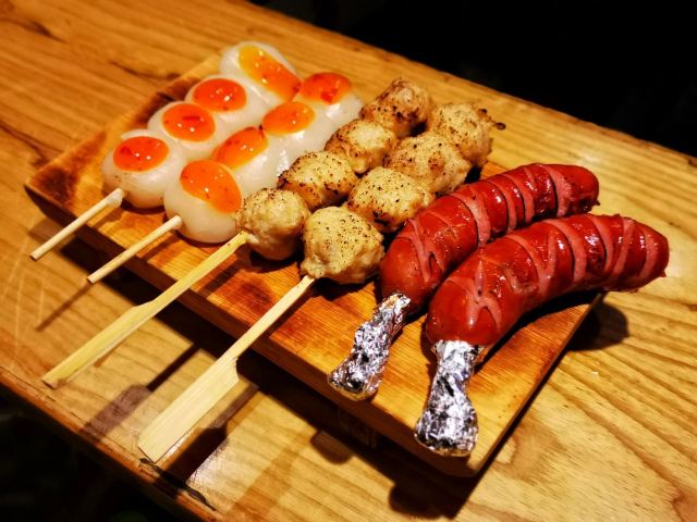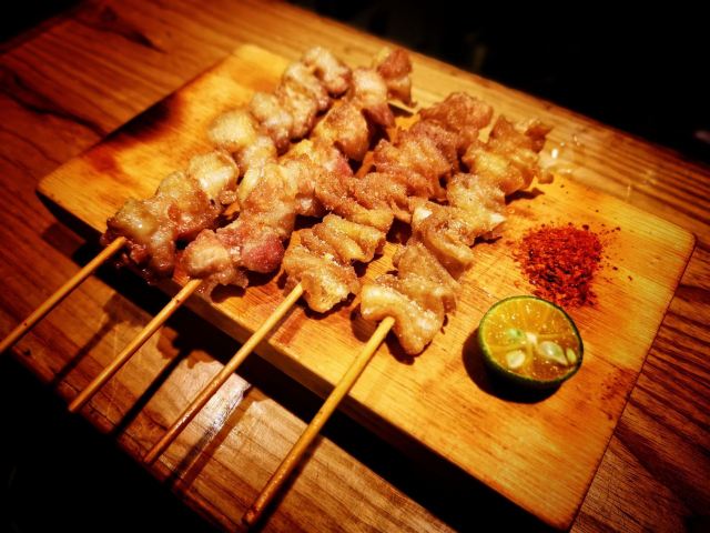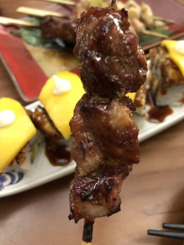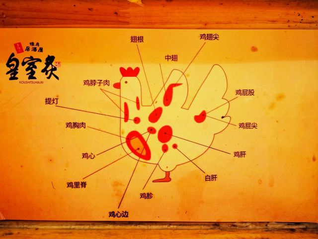 雨中之苇一串入魂,日式烧鸟居酒屋的夜 中山北路的日料真当是多,陆陆续续吃了好几家。这次要打卡的是位于187号的皇室炙·烧鸟居酒屋。 营业时间:11:30-14:30;17:00-01:00 交通:公交坐到贯桥站;地铁2号线坐到中河北路站 店面很小,空调外机被挤在了门口。打开玻璃门,暖意袭来,清一色的吧台位,倒是挺适合喝点小酒。纸灯笼、旧海报的装点,再配上日文歌曲,日式风情就足够了。 |盐水毛豆^12元 毛豆夹每个都颗粒饱满,真是下酒好菜。味道比较淡,几近原味了。 |芝麻秋葵^12元 芝麻酱拌秋葵,这个做法第一次尝试,竟然非常美味!麻酱香浓,秋葵鲜嫩。 烧鸟 烧鸟是他家的招牌,自然不能错过,这次尝了五种。 |白玉丸子串^10元/串 QQ的,糯糯的,配了甜辣酱,很开胃。 |素烧软骨丸子^10元/串 咸香可口,还很弹牙哦。 |带骨香肠^10元/串 香肠划过刀,更入味,表皮油滋滋的,很有弹性,抓着骨头吃贼过瘾。 |烤鸡软骨^8元/串 就是掌中宝,蘸点辣椒粉特别香。 |烤鸡皮^8元/串 一串4片,每片有点长,用筷子都搞不下来,哈哈哈。 |和风炸鸡^28元 鸡块的大小不一,样子略丑哦。淋点青柠汁,再蘸点酱,外酥里嫩,还是挺美味的。 |芒果鳗鱼寿司^28元 一份两个,芒果鲜甜,鳗鱼细腻,米饭紧实,再蘸点酱,这寿司就有了灵魂。 |鹅肝芝士蛋卷^48元 制作这道蛋卷的最后一步是火炙,香气飘来,不禁的咽了口水。鲜嫩的蛋皮里包裹着一片片鹅肝,芝士的催化让整道菜更为香浓。 |酸辣锅烧乌冬面^35元 一铁锅子的乌冬面,看着就好暖和。没想到居然是酸辣口味的,喝口面汤就觉得很暖和。里面还配了蔬菜、菌菇和肥牛,口味挺不错。 |可尔必思^12元/杯 可尔必思的乳酸味恰好好处,搭配烧鸟串串吃,清新解腻,完美! |大福^ 加老板微信还送大福哦,草莓和抹茶两种口味,饭后甜点刚刚好。