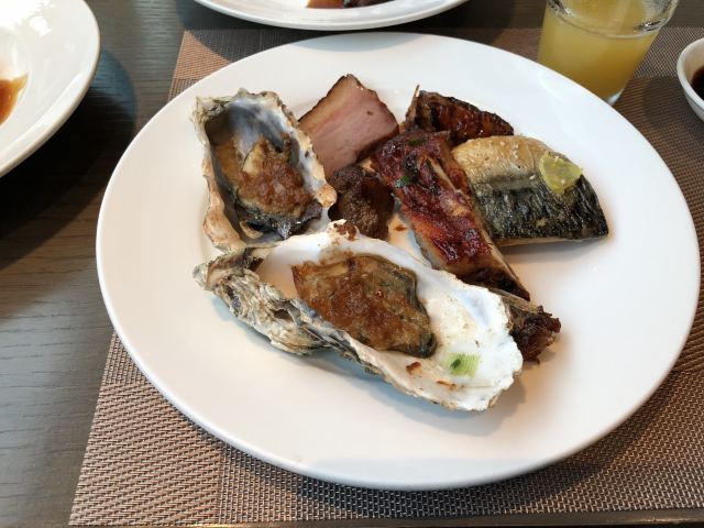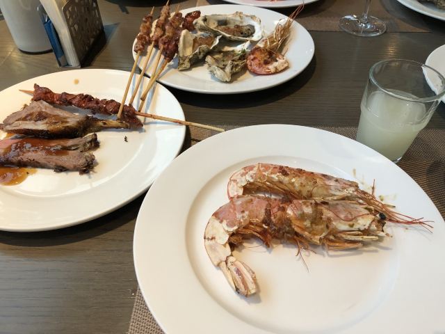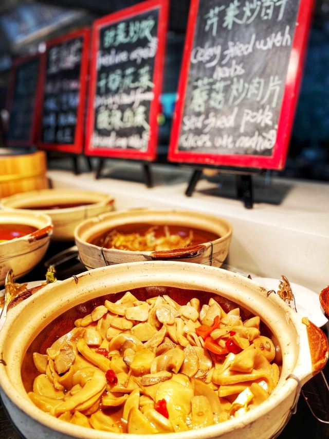 City Bistro - Hangzhou Marriott Hotel Qianjiang钱江新城万豪酒店就在公司旁边,上班天天经过,却没有进去过。这回沾公司的光,跟着领导去万豪酒店参加会议,晚餐就安排在酒店一楼的自助餐厅,太满足了。 餐厅最明显的位置是海鲜档和甜品台,有雪蟹脚,贻贝,螺,大虾,毛蟹等,各式蛋糕甜品更是让人眼花缭乱。 第一次在自助餐厅吃到鲍鱼捞饭,可以说是惊喜了。大个的鲍鱼,米饭上浇了鲍汁,配了大颗冬菇,看着赏心悦目。 现烤生蚝,大虾和羊肉串,闻着好香,也很受顾客欢迎。 服务员妹子温柔可亲,会主动帮顾客端食物,也会帮小朋友夹蛋糕。 据说吃自助餐吃最好境界是扶着墙进来,扶着墙出去。如果不是顾忌着形象,我肯定会吃到扶墙而出的。