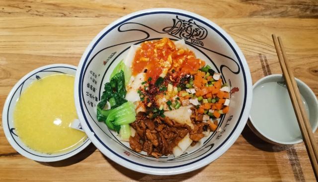 位置很好找,招牌 biangbiang面,有肉有素,面皮有嚼劲,番茄的微酸很开胃,整个拌匀之后很好吃。陕北有机小米粥,熬的很好,暖胃。