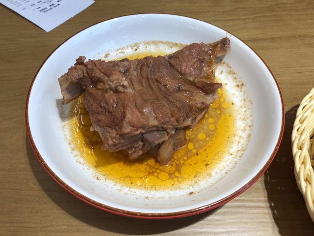 一块东北酱大骨,一个瘦肉肉夹膜,再来一份清炒菜心,有肉有菜,很满足的一餐。 酱大骨,很大一块,肉也多,抽屉里有手套,抓着吃不尴尬啊。 瘦肉肉夹膜,肥肉也有一点,肉汁味道不错,外面的饼又香又脆,趁热吃了大半个。 清炒菜心,菜心偏老,大概是吃菜心的季节过了吧。