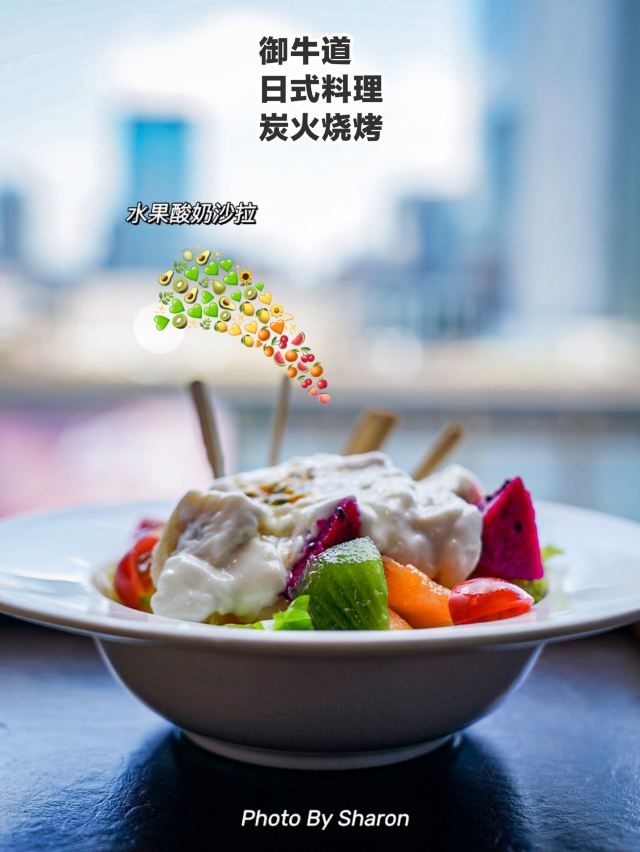 🍓 未未草莓🍓🍓杭州美食探店|御牛道日式料理炭火烤肉 🌈第一次来御牛道,印象深刻的是这个九楼的窗台。平视对面银泰大楼的顶层景观,再加上今天风和日丽的好天气。一个好心情,一份美食的期盼,周末的日式BRUNCH就这么华丽上演了。 [1人食]市中心一人食推荐,献上今日怎么吃菜单。 🐂店名:御牛道日式料理炭火烤肉 📍地址:杭州延安路,国大城市广场9楼 ⏰营业:11:00-13:00/16:30-21:30 🅿️停车:国大城市广场有收费停车场 🚇交通:地铁2号线,城市广场周边 👫排队:✅ 🌿环境: 国大购物中心9楼,直梯上。格局很紧凑,有多人围炉的烧烤吧台,也有多人小隔间。双人靠窗的座位我最喜欢,能看风景的位置谁能说不好。桌上烤炉用具,调料,菜单都全。 🌈服务: 纸巾的费用2元会自动入菜单,不过留意纸巾在哪里,最后没有用结账可退,大家注意了。 😋菜品: 「炸墨鱼头」💰28 一人食还是不要自己烤肉了,吃个现成的炸物也不错。墨鱼头脆嫩可口,烤的熟度正好不老。挤点柠檬汁,或者蘸沙拉酱,两种口味不单调。 「鳗鱼手握寿司」💰28 三只一份的寿司,正好一人的份量。很多评价都说一般,没有吃烤肉的我,用来当主食,觉得还不错。鳗鱼大块,醋饭糯糯的。 「水果酸奶色拉」💰32 是被颜值吸引到了,又是低脂健康食物,一人食毫无压力,满满一碗水果,有猕猴桃,梨,苹果,蜜瓜,火龙果,小番茄,生菜。用色香味俱全来形容是不是过于俗套。总之非常喜欢就对了。 ❣️TIPS❣️ 🌟日式烤肉料理店,也有各种寿司,面食,饭类单品可选。选择性强,适合多种场合就餐。性价比中等偏上。 🉑一人食,两人约,多人聚餐,周末约会好去处。国大商圈逛吃必选。 💰人均消费:88