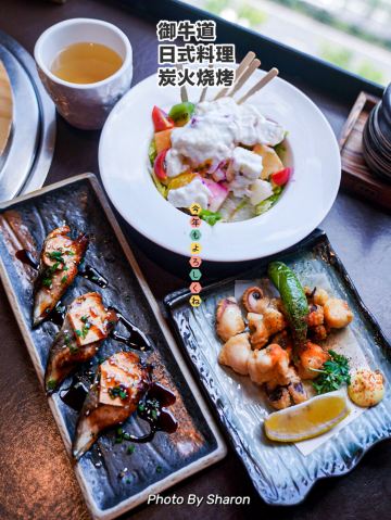 🍓杭州美食探店|御牛道日式料理炭火烤肉 🌈第一次来御牛道,印象深刻的是这个九楼的窗台。平视对面银泰大楼的顶层景观,再加上今天风和日丽的好天气。一个好心情,一份美食的期盼,周末的日式BRUNCH就这么华丽上演了。 [1人食]市中心一人食推荐,献上今日怎么吃菜单。 🐂店名:御牛道日式料理炭火烤肉 📍地址:杭州延安路,国大城市广场9楼 ⏰营业:11:00-13:00/16:30-21:30 🅿️停车:国大城市广场有收费停车场 🚇交通:地铁2号线,城市广场周边 👫排队:✅ 🌿环境: 国大购物中心9楼,直梯上。格局很紧凑,有多人围炉的烧烤吧台,也有多人小隔间。双人靠窗的座位我最喜欢,能看风景的位置谁能说不好。桌上烤炉用具,调料,菜单都全。 🌈服务: 纸巾的费用2元会自动入菜单,不过留意纸巾在哪里,最后没有用结账可退,大家注意了。 😋菜品: 「炸墨鱼头」💰28 一人食还是不要自己烤肉了,吃个现成的炸物也不错。墨鱼头脆嫩可口,烤的熟度正好不老。挤点柠檬汁,或者蘸沙拉酱,两种口味不单调。 「鳗鱼手握寿司」💰28 三只一份的寿司,正好一人的份量。很多评价都说一般,没有吃烤肉的我,用来当主食,觉得还不错。鳗鱼大块,醋饭糯糯的。 「水果酸奶色拉」💰32 是被颜值吸引到了,又是低脂健康食物,一人食毫无压力,满满一碗水果,有猕猴桃,梨,苹果,蜜瓜,火龙果,小番茄,生菜。用色香味俱全来形容是不是过于俗套。总之非常喜欢就对了。 ❣️TIPS❣️ 🌟日式烤肉料理店,也有各种寿司,面食,饭类单品可选。选择性强,适合多种场合就餐。性价比中等偏上。 🉑一人食,两人约,多人聚餐,周末约会好去处。国大商圈逛吃必选。 💰人均消费:88