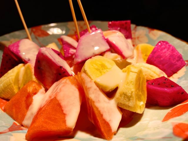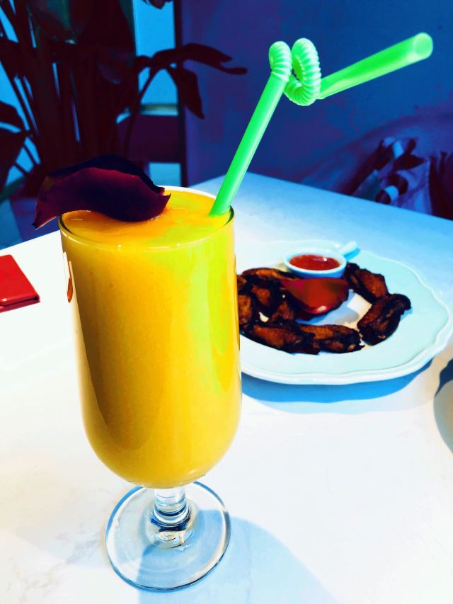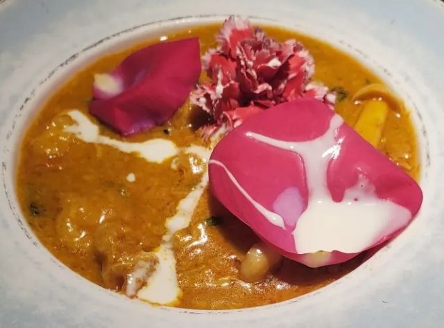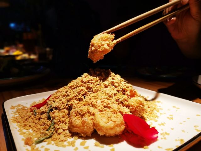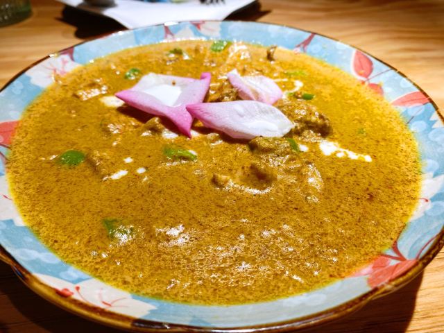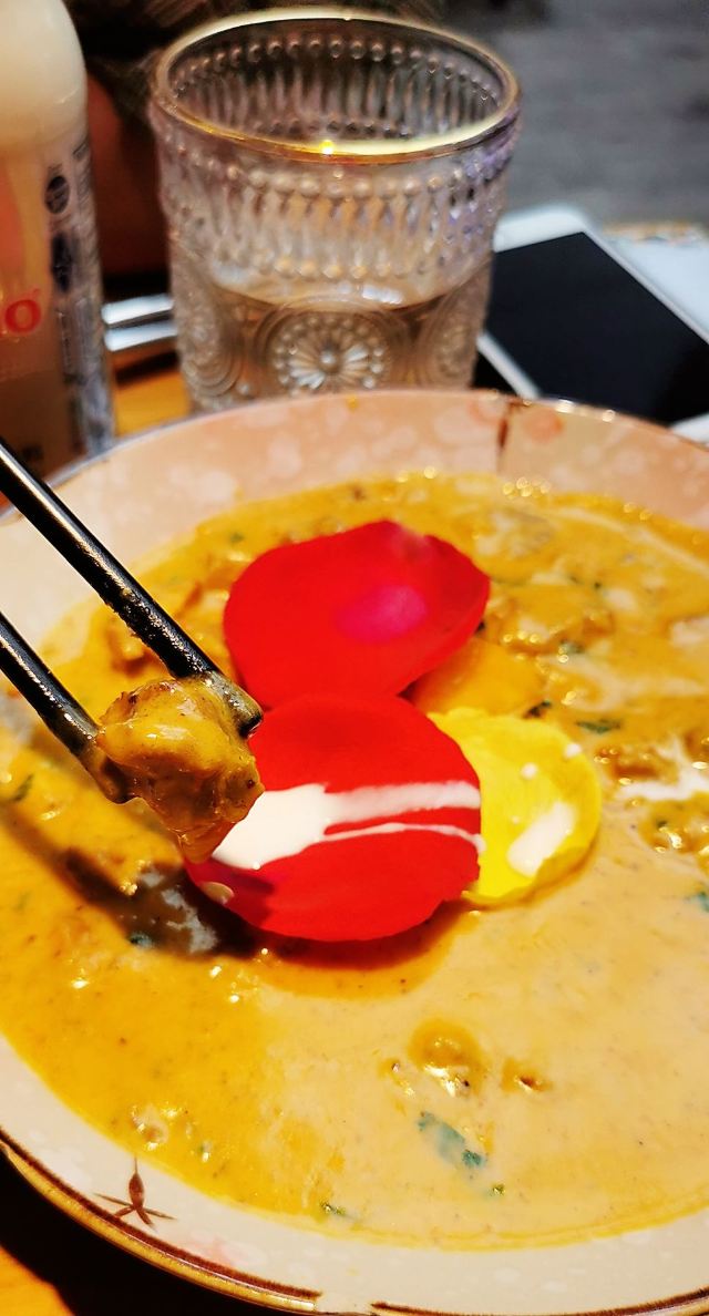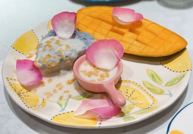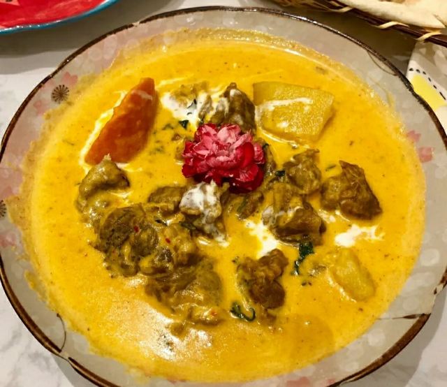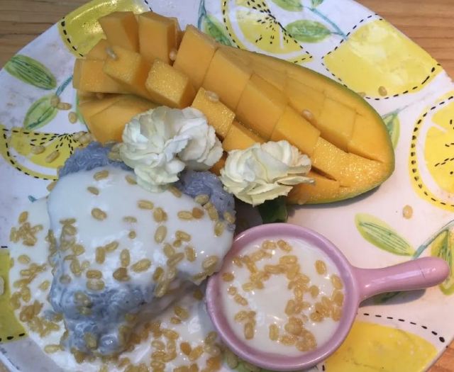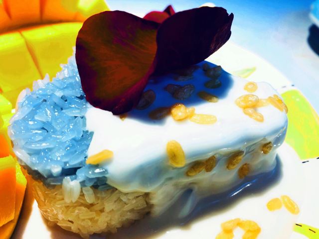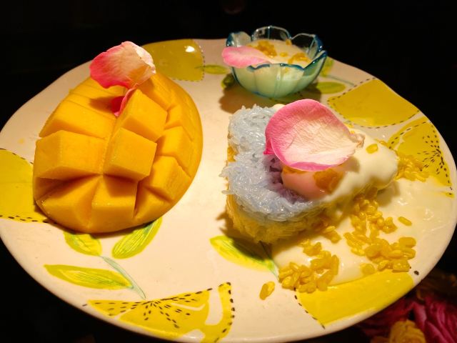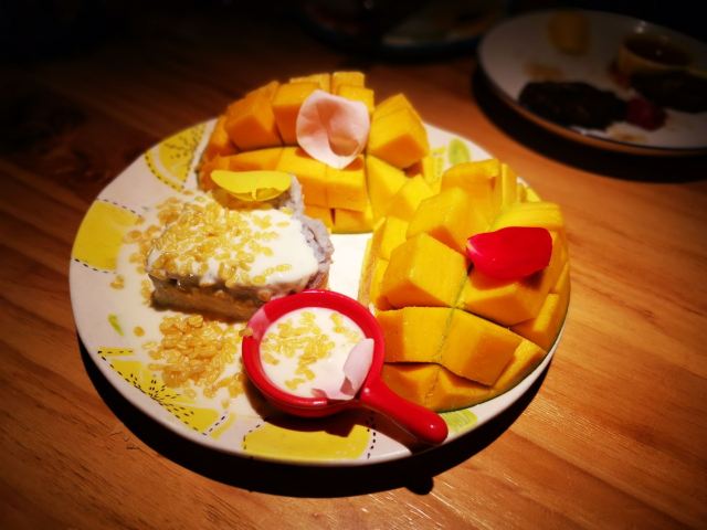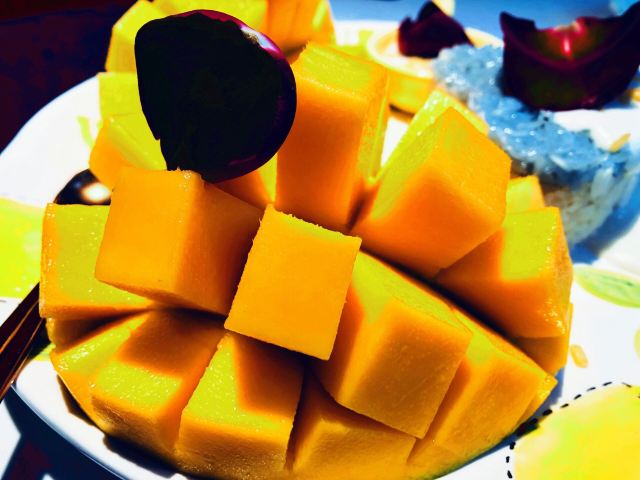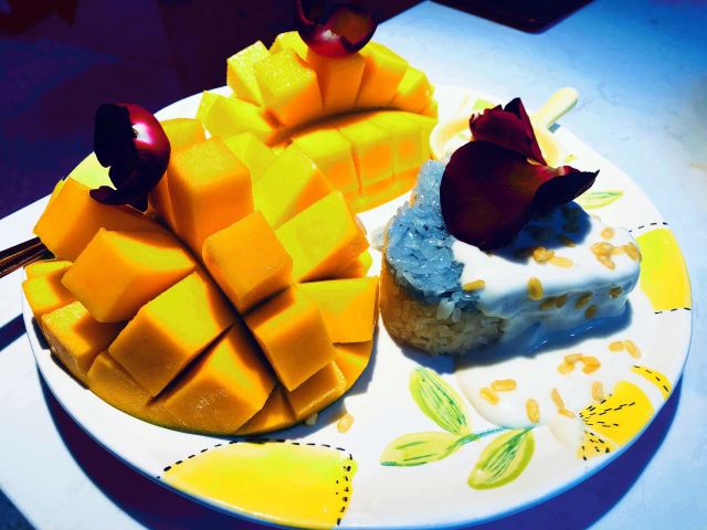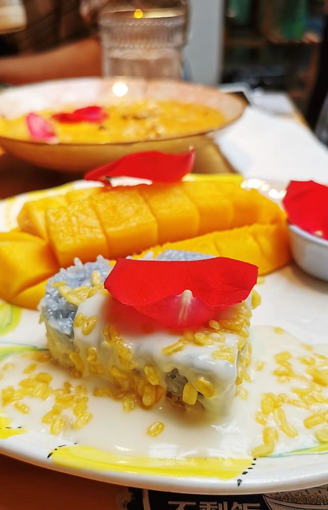 花的海洋,环境真的很漂亮,被漂亮的花给包围着,感觉超好。芒果糯米饭,造型不错,芒果甜甜的,配上糯糯的糯米饭,口感还不错。马来咖牛香是真的香,微辣,牛肉酥烂。