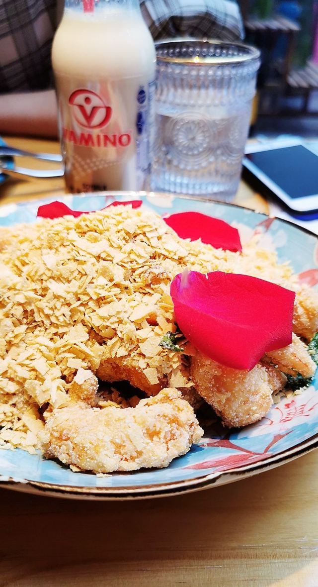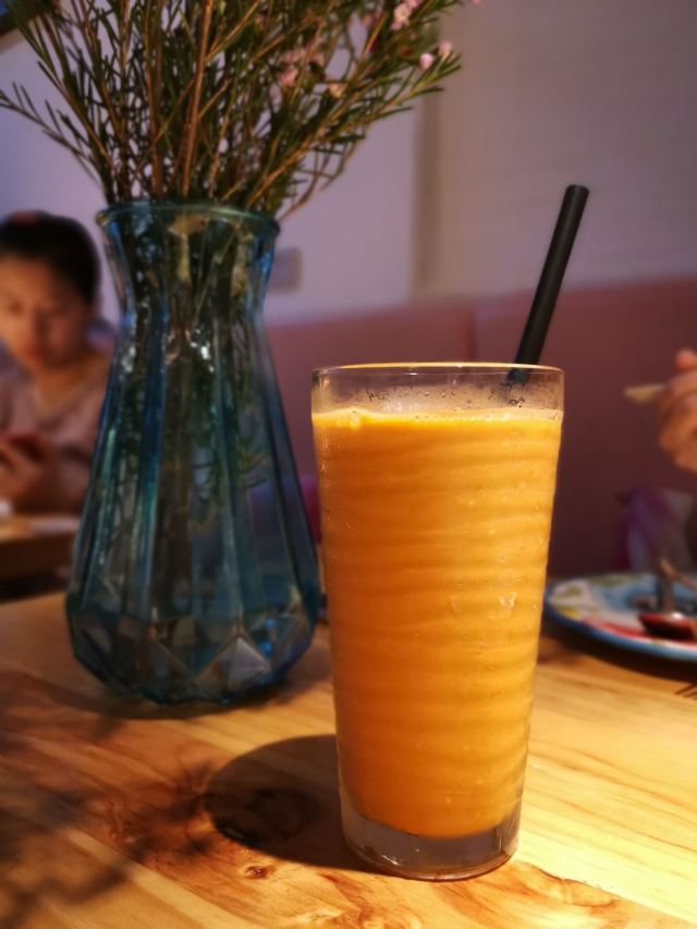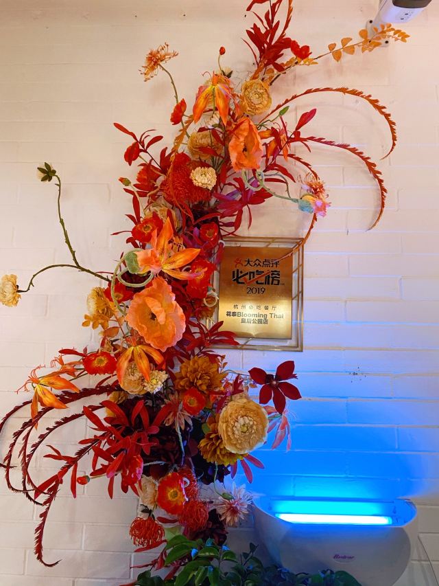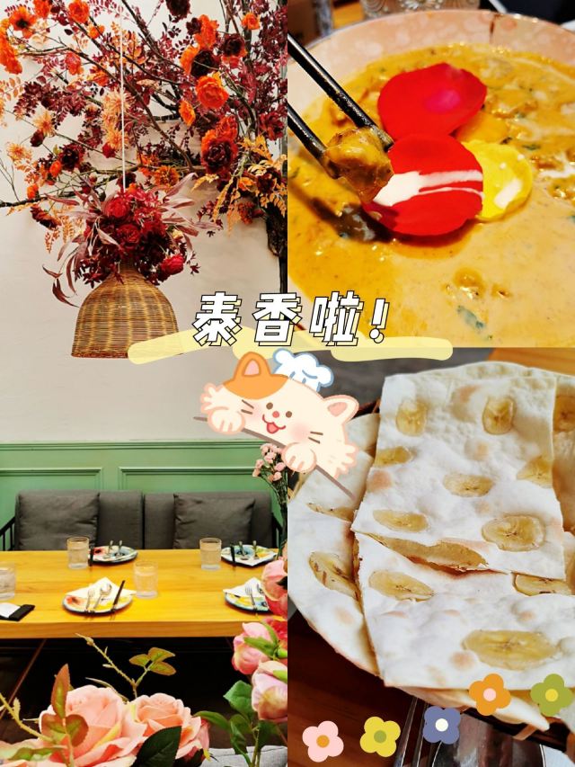 雨中之苇>>>环境 这是第三次来,花泰的门口以上放上了2019必吃榜上榜餐厅的牌子。拍照打卡、等位用餐的人络绎不绝,不过我的小伙伴已经早早的帮我们占好座了。   她家3-4人的桌子特别少,一定要早点去。整个餐厅倒出都是花花草草,真的假的,红的粉的,让人看了心情大好。   >>>菜品   花泰女皇咖喱 48元。女皇咖喱的玫瑰花瓣上恰到好处的滴了几滴椰奶,这大概就是所谓的娇艳欲滴。咖喱味道浓郁,里面的鸡肉鲜嫩入味。但这道菜的最佳打开方式,是用来拌饭,咖喱汤汁配茉莉香米,好吃到飞起。   麦片虾球 98元。这次吃到的新菜。虾球埋在麦片堆里,让我想到了另一道菜风沙仔排。虾球真的超级大,Q弹饱满,奶香十足。麦片里面还混着炸过的罗勒叶,香香脆脆也非常好吃。   芒果糯米饭 48元。两大块芒果,配了压制成心形的糯米饭,光是颜值就让人少女心炸裂。想要食用方便,可以请服务员帮忙去掉芒果皮。去完皮后发现芒果真的很多,而且非常香甜。糯米饭有3层,顶上洒的是黄色的脆米,下面紫色的是蝶豆花染的一层,最底下就是糯米饭了。三种混着吃,配上椰奶,又脆又软糯的口感,实在太迷人了。   西兰花炒大虾 58元。三次来都吃了这道菜,汤水依旧很多,大概就是特色。大虾个头也很大,西蓝花很清爽很脆嫩。   泰国炸鸡 42元。炸鸡用的多是切开的鸡翅,不拖面粉炸的,稍微有点焦。远远的看还以为是什么炸蚂蚱呢。不过味道很棒很香,蘸点甜辣酱更有滋味。   香蕉烤馕 20元。额外送了烤馕,选了最爱的香蕉味。趁热吃哦,享受又脆又有韧性的那种口感。   芒果汁、胡萝卜苹果汁 两款都是42元。原价价格较高,但确实是实打实的果汁,很好喝哦。   经典泰式奶茶 38元。三人前往,额外赠送一杯饮料,选了奶茶,居然也让我惊喜。茶香浓郁,奶味醇厚,又带点微微的苦味,恰到好处!