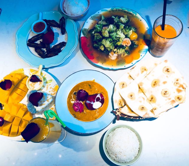 冬阴功汤,西兰花炒大虾,花泰彩虹卷,马来文火虾肉咖喱,芒果糯米饭,招牌冬阴功汤,女皇咖喱,鲍汁西兰花,香蕉烤馕,咖喱皇炒蟹,米饭,芝士烤馕,芒果汁,女皇咖喱鸡