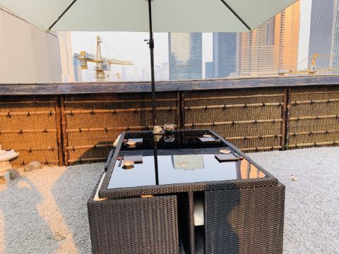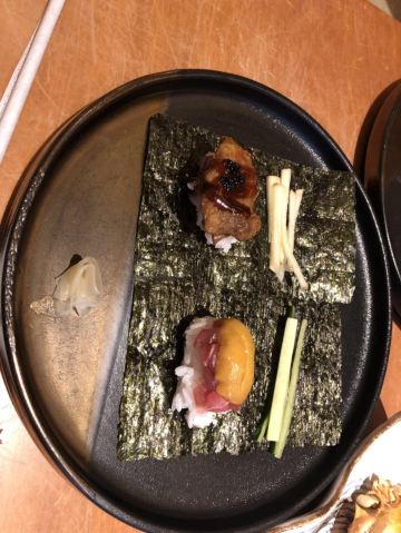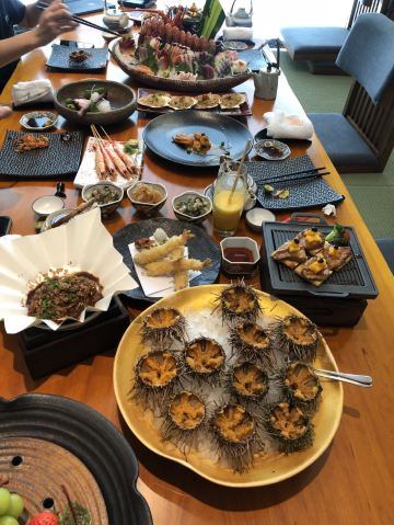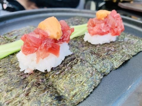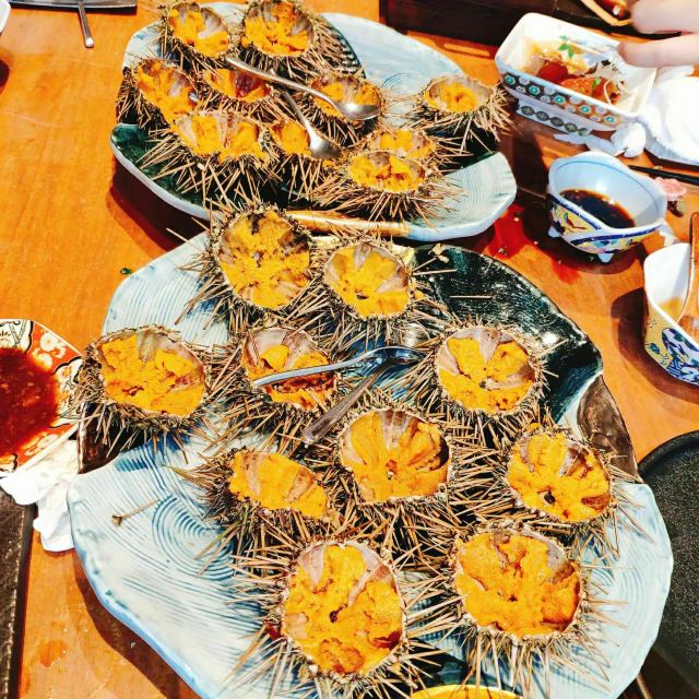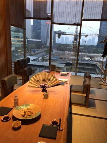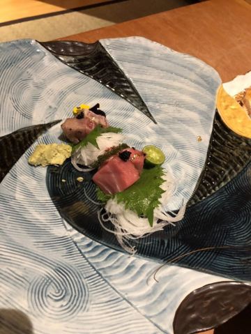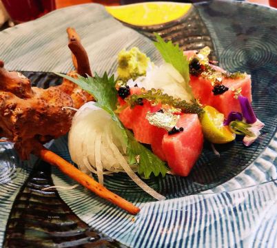 爱吃的感觉想了好几个月的日料自助终于在今天实现了,一点都没让人失望。环境非常有特色而且私密性很好,餐厅外面根本看不到里面的任何东西。里面进去就要脱鞋,夏天踩在软软凉凉的草席很舒服。 今天的重头戏是限量供应的蓝鳍金枪鱼,每人两片,切的是标准的1厘米厚度,上面铺了可食用金箔象征着鱼的地位。裹着现磨的山葵,蘸着酱油,入口即化! 其次爱的是海胆,我能说这么大一盆都是吃我一个人吃的吗?海胆的味道真的是尝过的人就会忘不了,这家的海胆很新鲜,鲜甜的细腻的口感。给了一个小勺子慢慢挖,可以从头吃到尾! 鳌虾个头超大比我的手掌还长,肉质很丰满,糯糯的超好吃呀! 生蚝个头虽然不大,但是里面的肉质却非常饱满加了鱼籽和柠檬汁,吃起来很嫩滑一点腥味也没有,吃不惯生的,还有蒸汽生蚝哦!但是我更偏向于生的,更鲜嫩一点。 焗蟹宝这个虽然很好吃但是一定要忍住最后吃哦!因为芝士很厚重容易腻而且有饱腹感。吃了这个别的就不太吃得下了。 今天点了好多菜没有踩雷的,都是光盘。另外服务小哥哥和小姐姐穿着和服都好好看,服务也是热情有礼貌。小哥哥来给我们收拾空盘看我们吃的差不多就会提醒我们可以加点别的菜。第二轮第三轮上的菜也都是超快的,这点跟别的自助比起来强太多了!除了贵,其他没毛病。