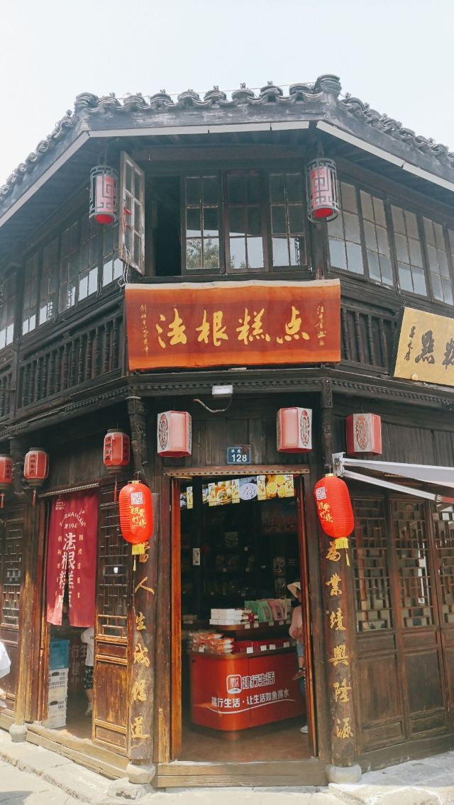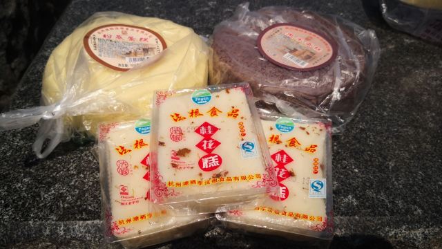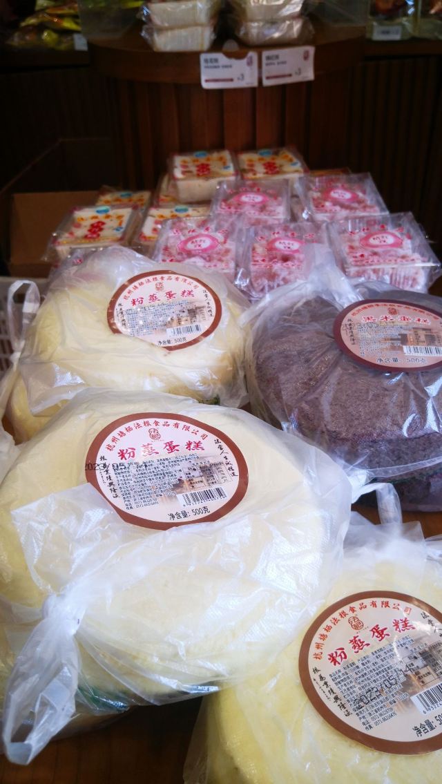 法根糕点,就在朱一堂的对面,颇有点打擂台的赶脚,但不得不说,在塘栖的两天里,次次走过广济桥时看到的,他家的客流量没朱一堂多。 对发根的前生后世不甚了解,但第一次看到店标,脑海里想到的就是法式法棍,但据说发根也是一家做杭州传统点心的老字号。 看了介绍,桂花糕是首推,看到店里也是一堆蒸糕,也不知是什么念头一起,于是原味和黑米的也各拿了一种,有点想比较一下两家的哪个好吃些。