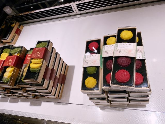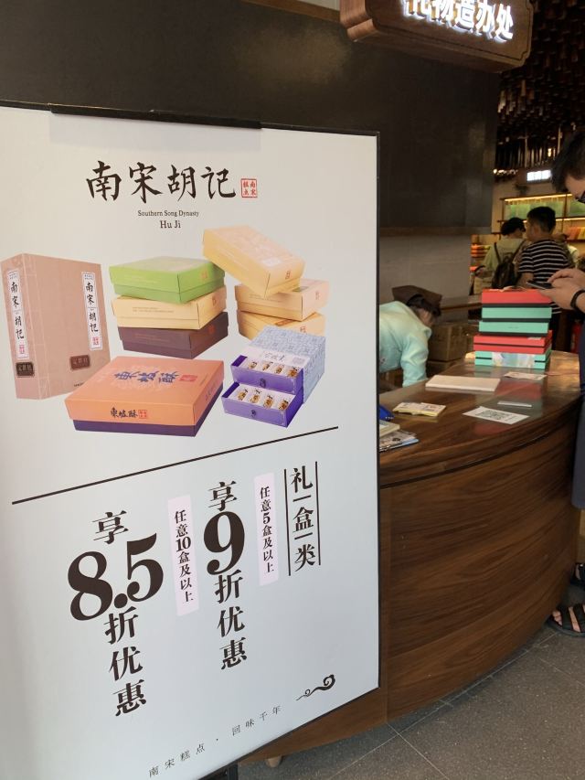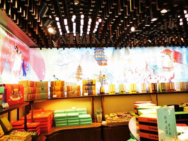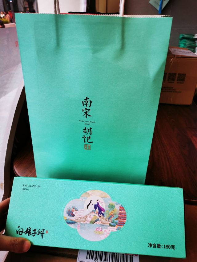 南宋胡记,专营杭州传统糕点,湖滨银泰D座,东坡路上,从来就大名鼎鼎,人气满满。 西湖之畔,游人如织,南宋胡记,作为伴手礼,确实很赞。 [薄荷]环境: 醒目的门头前面,是白娘子和许仙的Q版造型。 店内空间极其宽敞,密密麻麻的几何状灯饰,让景区原本昏暗的老房子,充满了热情的明亮,色彩斑斓的各种礼盒,在空间里俏皮地撞色。 透明的玻璃柜挡不住糕点的浓香,各类糕点大方免费试吃,垂涎欲滴,一饱口福。 [服务铃]服务: 服务员带着帽子口罩,卫生方面非常放心。招呼热情主动,欢迎顾客试吃,装盒、收银高效利索,连锁品牌服务,向来训练有素。 |绿豆糕组合^冰绿豆糕,软软糯糯,清甜细腻。 |白娘子饼^荷花酥售罄,于是换了白娘子饼。一盒三粒,白娘子饼、许仙饼、小青饼。 如蛋黄酥一般,白娘子饼层层酥脆,浓郁的芝士香,伴随着酸甜的蔓越莓粒。当中式糕点与西点经典元素结合,舌尖回味,流连忘返。 南宋胡记的礼盒包装都优雅精美,自己吃或送人两相宜。 当蒂芙尼色的手袋里,装上蒂芙尼色的礼盒。 南宋胡记,蒂芙尼色的杭州回忆,仿佛西湖盛夏的荷叶色,如此沁人心脾。