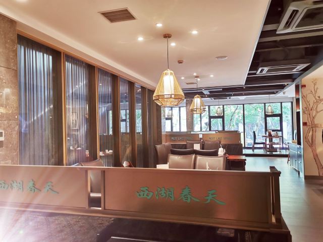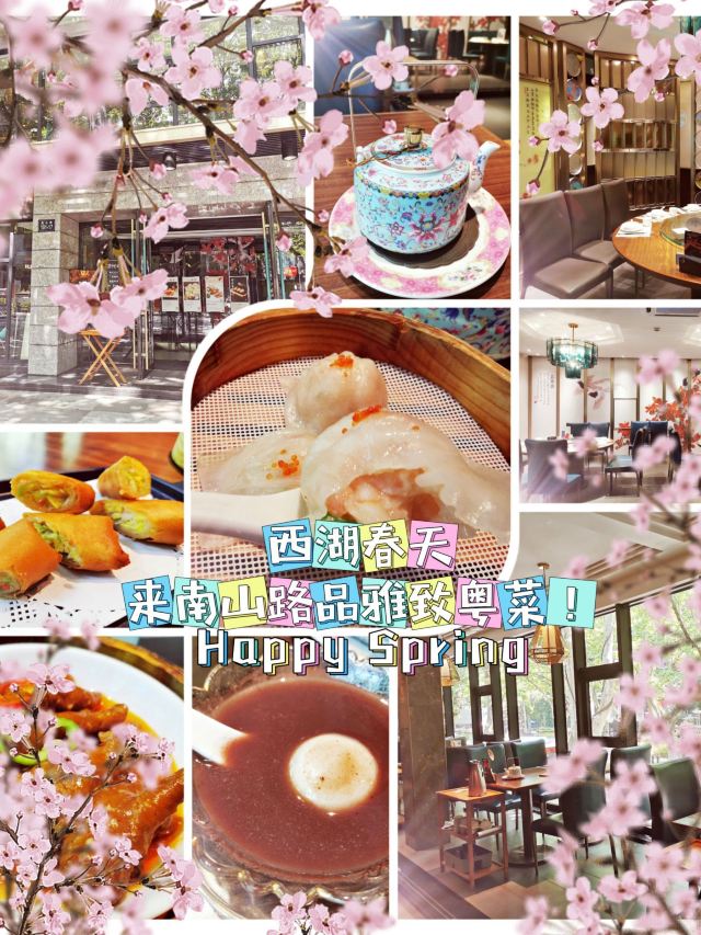 平安夜的蚊子西湖春天,地址南山路101号。 🚗交通 地铁一号线定安路C出口 🏖️环境布置 漫步南山路,春光旖旎,美不胜收。 钱王祠、柳浪闻莺、中国美院等,景区密布, 历史人文底蕴深厚,古典与现代融合,浪漫与优雅交融。 西湖春天,一家开了17年的粤菜老字号品牌,亦不负这春日的浪漫氛围,来南山路品雅致粤菜吧! 树荫环绕之下,这座独立的小楼,是许多老杭州们的聚会圣地。一楼是等候区、海鲜区以及烧腊等的厨房,二楼是堂食区域和包厢区域,环境非常宽敞明亮,以蓝色与原木色为基调,展现江南水乡的古典美,又不失高雅时尚的现代美。 坐在二楼的窗口区域,光线明亮,沙发舒适。望着窗外南山路街景,满屏的绿意盎然,生机勃勃。心情无比惬意舒畅。 💁服务态度 服务态度很不错。开店时间没到,就有一大波阿姨在等待吃饭。迎宾热情款待,让大家先在一楼休憩,二楼堂食区,卫生搞好了,马上请大家上楼点餐。 餐厅没有采取当下流行的扫码点单,依然采取人工点单,对于叔叔阿姨的问询,也很有耐心,还教老年人如何使用平台的折扣。西湖春天,一直深受本地老年人青睐,果然实至名归。 🍜美食推荐 |春天虾饺皇^虾饺皮晶莹剔透,虾仁只只饱满,入口Q弹有嚼劲,鲜嫩爽滑。 |百合酱凤爪^酱香浓郁,一抿脱骨,入口即化,软糯鲜香。 |鲜虾炸春卷^金黄酥脆的外皮,包裹鲜虾与蔬菜,有点微微辣。 |红豆沙汤圆^红豆沙细腻绵软,汤圆软糯弹牙,清甜可口。 |香芋西米露^赠送,香芋紫色泽清新,热乎乎的暖胃。 📌贴心TIPS 营业时间:10:00-14:30 16:30-21:30 人均消费:151元 西湖春天,来南山路品雅致粤菜!