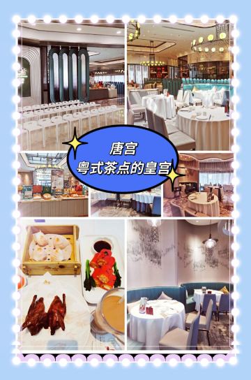 平安夜的蚊子唐宫,地址富春路701号万象城5楼 🚗交通 地铁四号线江锦路B3出口 🏖️环境布置 唐宫,作为著名的粤菜馆,已经是12年老字号了。风格富丽堂皇却不艳丽,蒂芙尼色孔雀蓝,跳跃在米白灰简约色调里,搭配精心设计的吊顶,仿佛置身于精美雅致的粤式茶楼。非常种爱粤式茶点,这里多的琳琅满目,随心选择。 唐宫,粤式茶点的皇宫。 💁服务态度 一进店就热情招呼,引导就坐。靠窗位置,有些晒,就立即拉上窗帘,送上|花生米^。就餐过程中,及时更换骨碟。就餐结束后,也有询问用餐感受。不过需要提醒的是,乳鸽是上午十一点以后才有的。早上十点半来,需要等上半个小时。湿巾纸也是收费的,可以问服务员要纸巾。 🍜美食推荐 菜品造型精美,份量也足够大,|茶单^更是设计滴古色古香。 |唐宫虾饺皇^洁白饱满的大颗虾仁,包裹在晶莹Q弹的虾饺皮里,蘸着|虾饺陈醋^口口Q弹,鲜甜多汁,不愧是虾饺皇。 |脆皮鲜虾红米肠^外皮红润酥脆,卷着鲜虾鲜美滋味,一点都不油腻。 |唐宫金奖乳鸽^等了很久的乳鸽,皮脆油亮肉嫩多汁。无奈吃不惯乳鸽的味道。尝试过就好了。 |丝袜奶茶^赠送的,口味浓郁,品质用心。 📌贴心TIPS 营业时间:10:00-15:00 17:00-21:30 人均消费:158元 唐宫,粤式茶点的皇宫。