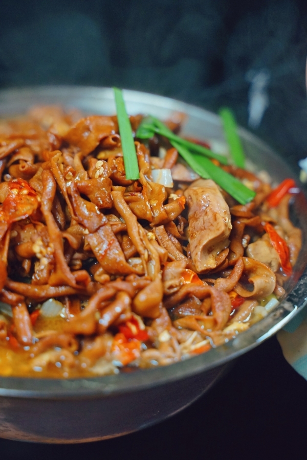 鸭肠火锅,土豆饼,醋炒鸡,椒盐玉米,小杂鱼,敲扁土豆,秋葵,糖醋排骨,鸭肝,青菜