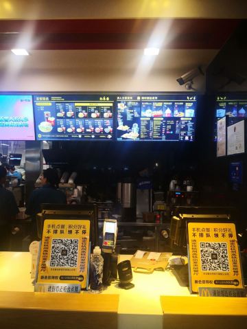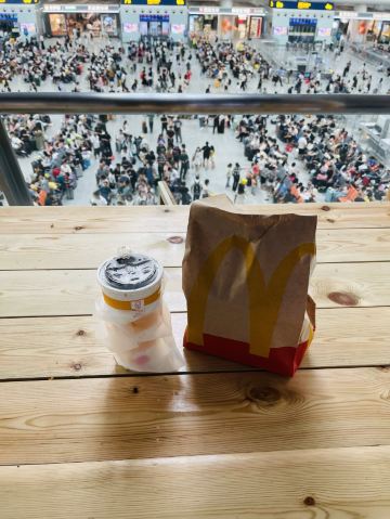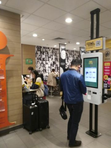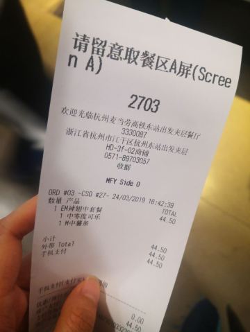 McDonald's (hangzhoudongzhangaotie)杭州东站候车厅二楼的麦当劳,自助点餐下单了一个麦辣鸡翅套餐,2对鸡翅加上中薯条再一杯可乐,一共44元5毛,比外面的贵一点,不过薯条外面带进来的确不方便,所以就里面买了,反正买的也不多