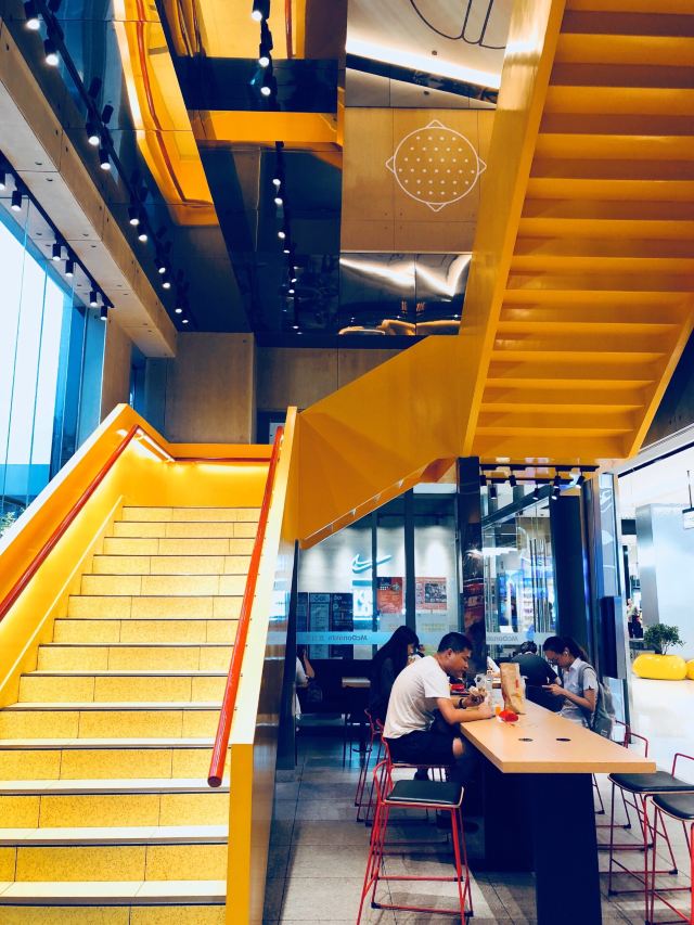 杉尼【位置】位于杭州庆春商圈杭州大厦501城市广场北侧商铺。 【菜系】主打美式简餐。 【价格】菜品可以单点,也可以套餐,人均价格在50元左右。 【环境及落座感受】这家今年6月19日开业的店是我见过的最具个性化的麦当劳!金色炫酷黄亮酷了整个底商,超大的门面,超宽敞的空间,既有日式榻榻米风格的座位,又有欧美概念设计的桌椅,还有二楼的卡通投影设备,再加上酷萌的粉色外卖窗口,一切都令人惊艳不已!服务员很热情地引导点餐,可以人工点餐,也可手机点餐,还可以机器自助点餐,方便快捷! 【菜品1】麦辣鸡腿堡 (特色)这是店家的招牌菜之一。每月9日会员日会有活动积分免费兑换。它用麦辣鸡夹蔬菜一起享用。有嚼劲,带辣味。 (器皿)简单的一张纸包裹,减少了纸盒的浪费。 (食材)鸡肉一块煎炸,蔬菜叶若干,沙拉酱少许,面包胚两片。 (吃法)乘热夹着汉堡几大口吃完,超节约时间成本! 【菜品2】薯条 (特色)这是麦当劳的拳头产品,与肯德基抗衡。在欧美,超过十几分钟以上的薯条就扔了!吃的就是口感最热最新鲜!可是国内好像没有如此做! (器皿)此菜用纸盒盛放,可阻隔油腻。 (食材)薯条煎炸 (吃法)可以直接食用,亦可沾番茄酱食用。 【菜品3】奥利奥麦旋风 (特色)这个冰淇淋深得孩子喜爱。奥利奥的香浓,拌匀入冰淇淋中,好玩又好吃! (食材)奥利奥饼干粉,冰淇淋。 (吃法)一定要搅拌均匀后食用,风味浓郁!在外卖窗口第二个半价! 【服务态度】服务生态度和蔼可亲。 【适合人群】主要面向恋爱情侣,亲子家庭。 【商户对比】店铺的装修环境绝对一流!优于其它麦当劳店铺! 【交通设施】地铁二号线庆春广场站下,直达杭州大厦501,从盒马生鲜上楼即可。公交车有186、45路庆春广场站可达。开车商场有停车位。 【优惠措施】有会员活动优惠,每月9日前有会员积分兑换活动,免费哦! 【小贴士】可以带上书买点麦当劳食物,坐在日式榻榻米上享受阳光下午时光,很悠闲自在! 【总体感觉】环境优雅,服务优良,方便快捷,味道不错。