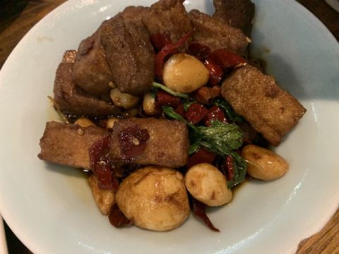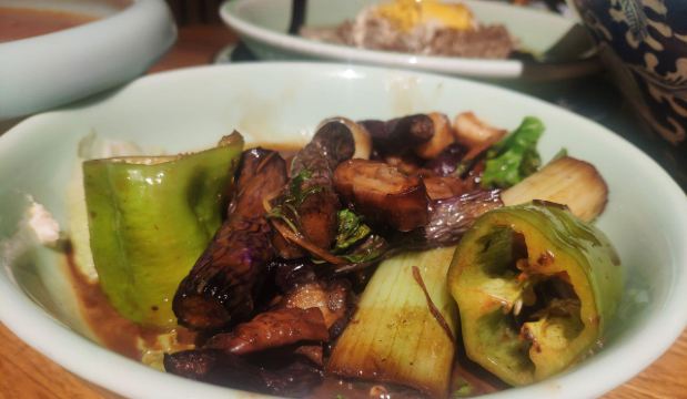 江南驿就在法喜寺对面,由一栋旧式木质二层小楼改造而成,内部也都是木质桌椅,复古又有情调。这里的菜味道出众,口碑也非常好。最受欢迎的是椒麻鸡,滑嫩的鸡肉上放了辣椒葱丝等,非常可口。孜然菠菜、南乳仔排等也很受欢迎。