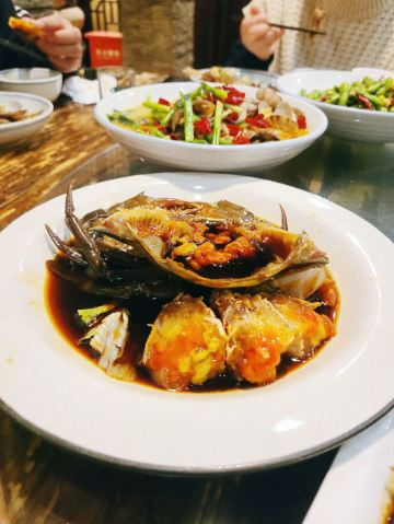 LC大人麻麻必吃榜餐厅拔草之旅--江南驿(上天竺店)。 从梅灵北路到梅灵南路到天竺路,沿途在西湖群山中穿行,清新的空气令人耳清目爽。 天竺路上就有景区停车场,这点很方便。 江南驿似乎座落在花园之中,天气好的日子,室外景观位是不错的选择。 进入室内,有种到了“同福客栈”的感觉,热烘烘的,人气很足,装饰上又有现代旅舍的风格,让来自四方的旅行者有种熟悉的味道。 提早致电预约了一张圆桌,头顶的灯光照耀,周围一圈细竹,完美! 【椒麻鸡】招牌菜,在江南驿的运河店,每次必点。 熟悉的花椒味一触及味蕾,立马唤醒了舌尖,非要吃到嘴唇发麻震颤,是不会停下来的。 【香椿炒河虾】时令野菜--香椿,已经上升到一种财务自由,叫“香椿自由”。湿冷的冬天难耐,盼望春天的心情急切,吃到“香椿”的那一刻,告诉自己春天真的来了!河虾大小均匀,过大油锅,河虾外壳脆,虾肉鲜嫩Q弹,香椿河虾相得益彰! 【青蟹煮面条】好大一份,面条量超级多。青蟹肉饱满鲜美,大钳里肉满满的。面条有了炒青蟹的汤汁,简直就是青蟹拌面。 【葱焖鲫鱼】小葱放的超级多,鲫鱼很鲜,说不定是野生的呢! 【糟鸡蛋肉饼臭豆腐】糟鸡蛋属于早有耳闻,今天终于面见真容。挖了一勺,小小的吃了一口,哇哦!粉粉的口感,连蛋白也是粉粉的哦!而且非常细腻,糟味相当浓郁,酒香,鲜味俱佳。相对的臭豆腐倒不惊艳了,而肉饼吸取了糟和臭两味真气,也变得很独特。这个菜好像是上天竺店的新推菜品呢! 【咖喱土豆花菜】毫无违和感,土豆绵软带细腻沙感,堪称优质土豆。花菜的加入,多了一重脆脆的蔬菜,真的好好吃。 【茄子大肠煲】【卤鸡爪】都是在运河店的必点款,上天竺店都保持了一贯的品质,甚至更甚一筹。 【黑枣酒】【西瓜柠檬汁】原汁原味,都挺好喝。