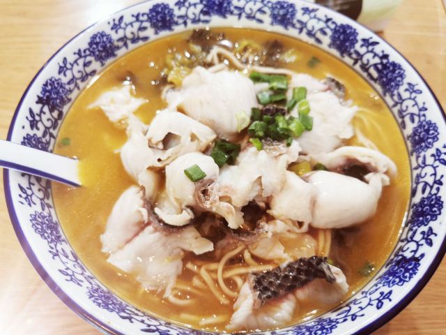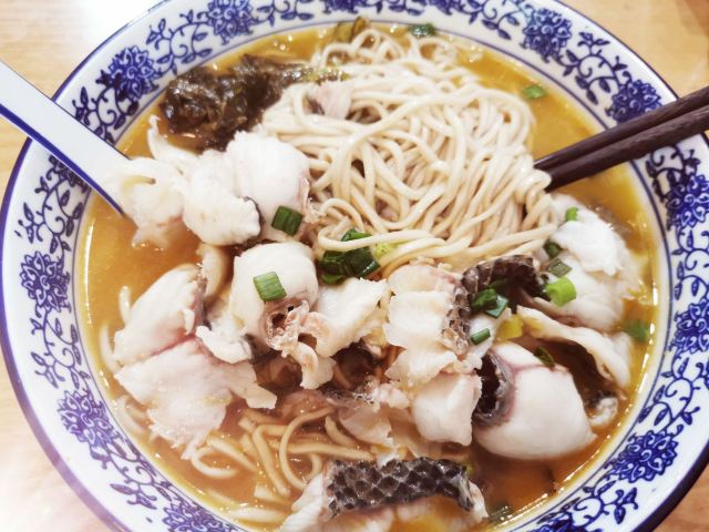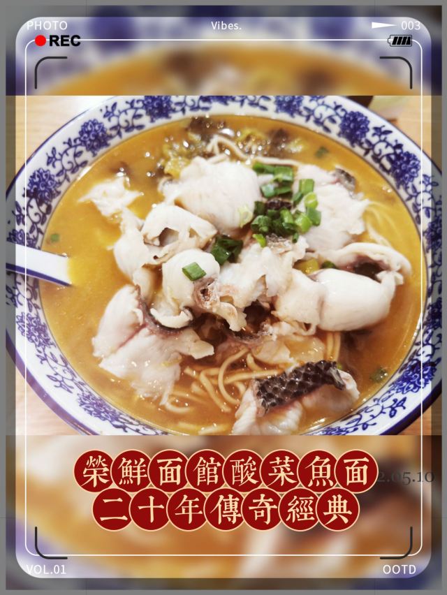 荣鲜面馆,地址邮电路46号。 🚗交通 地铁一号线龙翔桥D1出口 🏖️环境布置 邮电路上,“荣鲜面馆”大名鼎鼎,门面却不大,只放得下几张桌子。门面古色古香,店内墙上水墨彩绘,生动无比,带你穿越老底子杭州墙门。复古吊灯,很有怀旧感,沉浸式体验,荣鲜面馆二十年杭州往事。尤其是这碗招牌酸菜鱼面,成就二十年经典传奇,一定要尝一尝。 💁服务态度 来的时候尚早,店里不忙,服务态度还可以。 🍜美食推荐 |招牌酸菜鱼片面^青花碗装着热气腾腾的面,汤色红润格外有食欲。汤头浓郁酸辣鲜美,黑鱼片细薄鲜嫩,几乎无刺。面条份量格外足,热汤里泡久了,口感软烂有嚼劲,一口气光盘,舍不得浪费一点点。招牌经典,值得推荐。 📌贴心TIPS 营业时间:9:00-20:00 人均消费:30元 荣鲜面馆酸菜鱼面,二十年传奇经典。