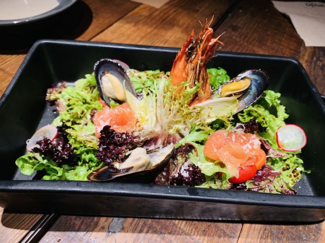 mamala之前去了2次不是没位子就是预约满了,这次提前了3天就去预定了,门口停车还算比较方便的,点了几个菜之后会告知我们差不多了,再多就要吃不完了,海鲜沙拉的味道不错,主要是食材比较新鲜,所以做出来之后口感很赞,还有比较喜欢的就是老虎虾,口感还是不错的,推荐最多的就是吞拿鱼马铃薯千层派,但是有点腻,不过味道还是挺不错的